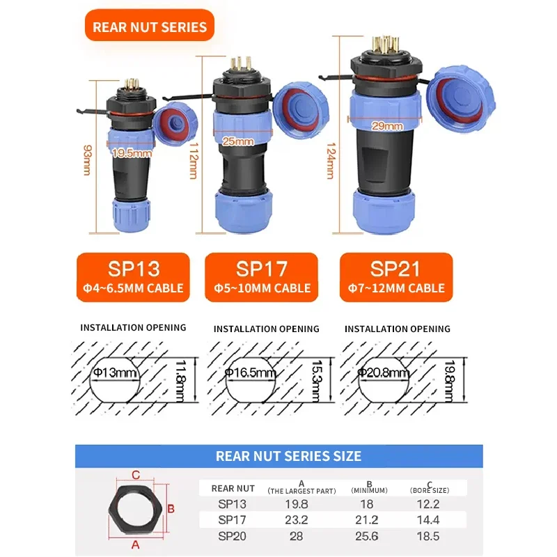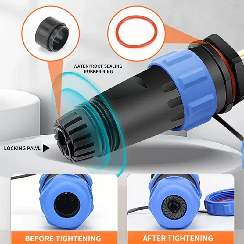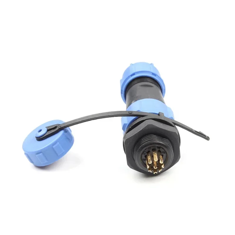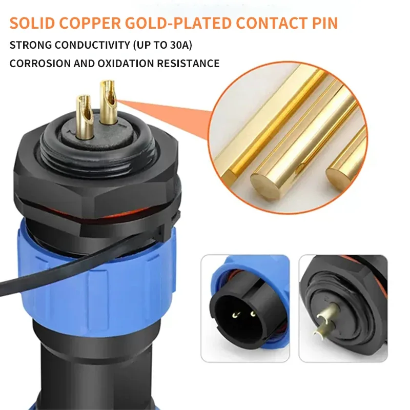 Experience secure, durable connectivity with this IP68 waterproof aviation connector featuring a rear nut configuration and available in 2, 3, 4, 5, 7, 9, and 10 pin options. Designed to operate at 24V, its robust cylindrical body combines matte black insulation with vibrant blue locking rings featuring ridged grips for easy fastening. Gold-plated pins enhance conductivity while adding a sleek metallic shine, perfect for harsh environments requiring vibration resistance and waterproofing. Whether you need reliable connections for industrial machinery, automation, or outdoor equipment, this connector’s high-quality design ensures a confident, long-lasting connection every time.