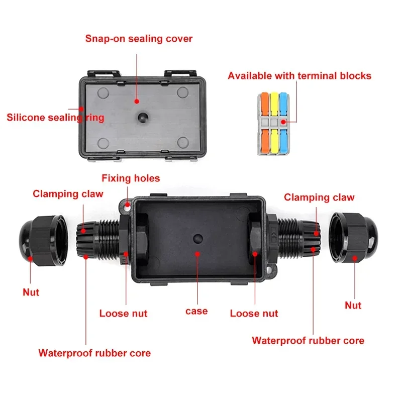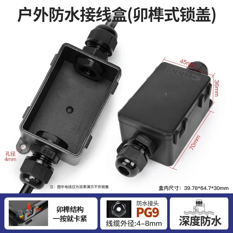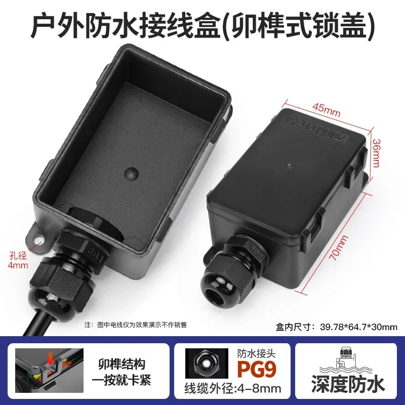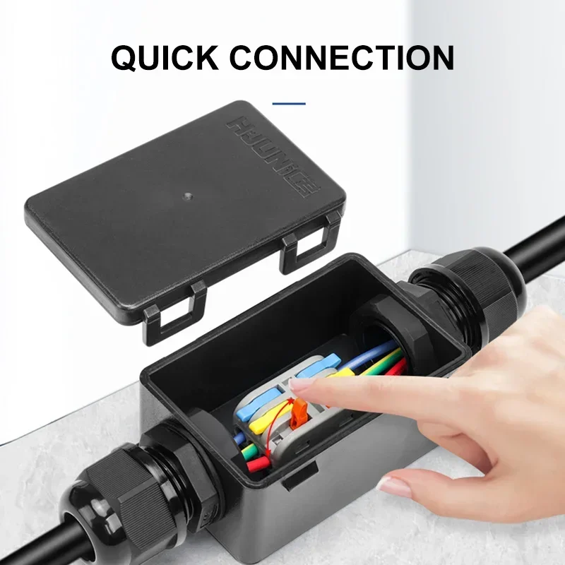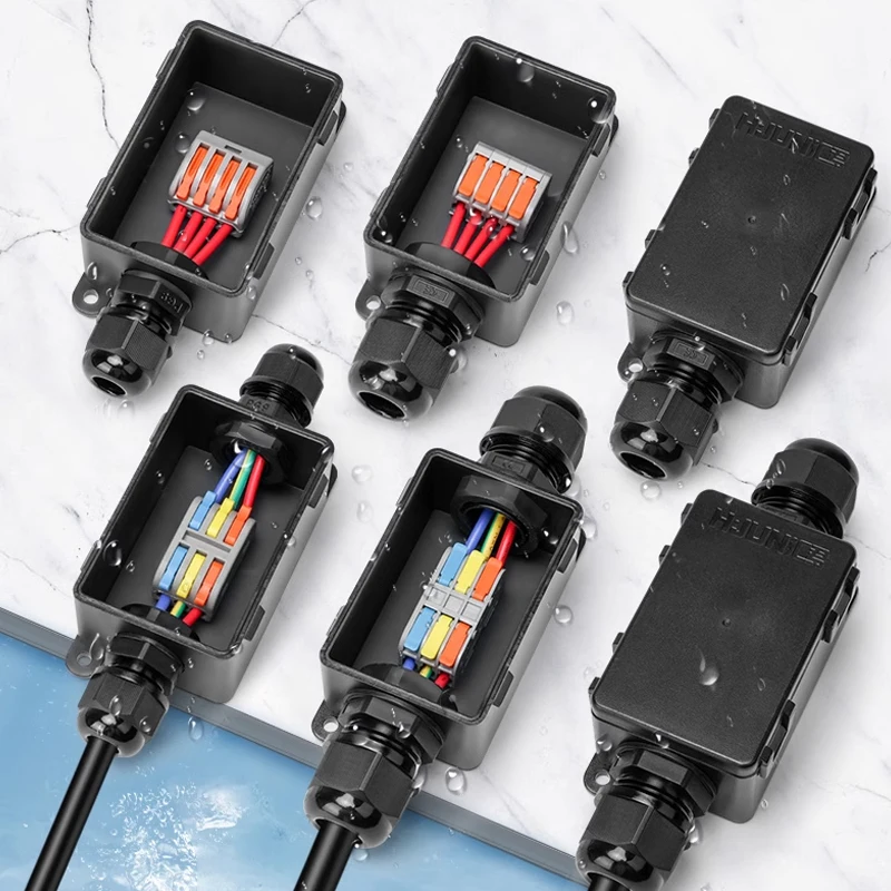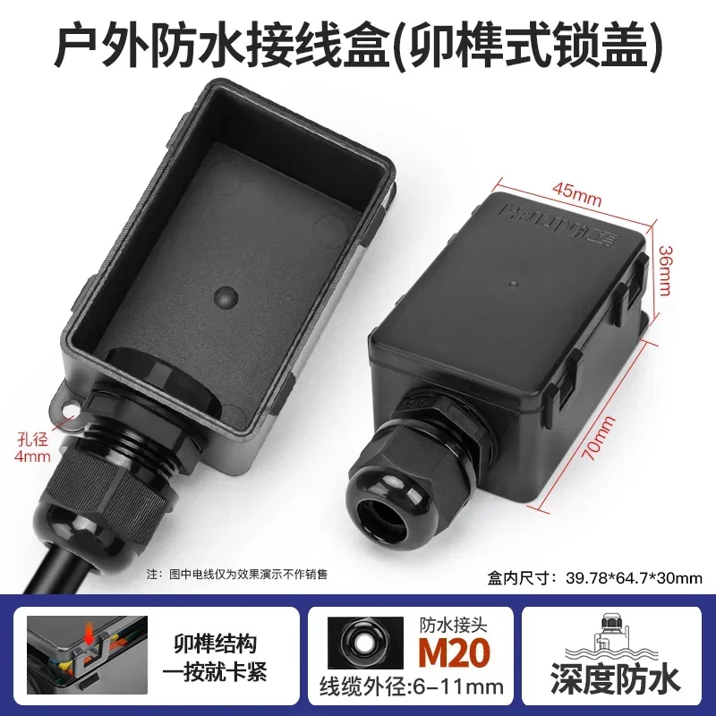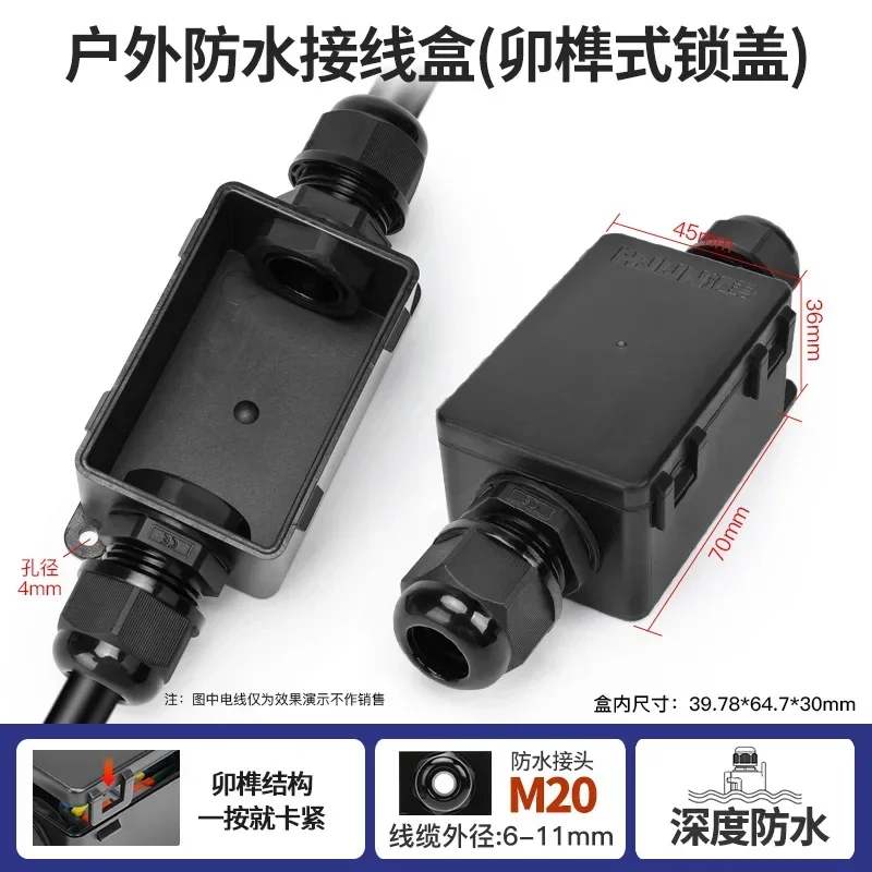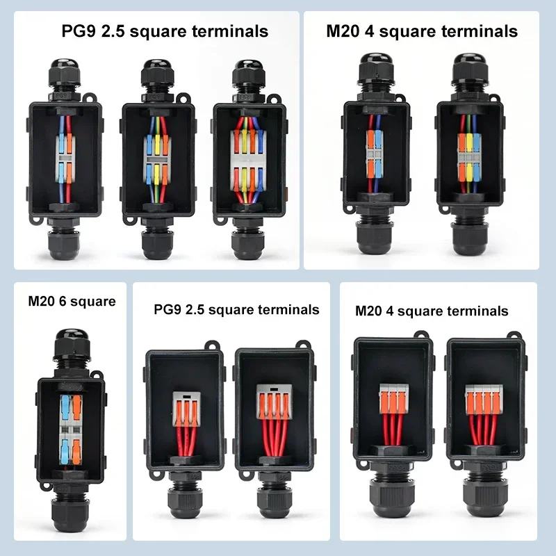 A durable outdoor waterproof junction box crafted from black polycarbonate, featuring a rectangular design with a textured, secure snap lid and embedded hinges. Available in multiple configurations from 2 to 5 ways, with models supporting M20 sizes from 2.5mm to 6mm and PG9 connectors. Equipped with waterproof cable glands and sealed fittings for reliable cable management and protection against environmental elements. Fire-resistant and RoHS certified, this versatile enclosure is ideal for street lighting, buried wiring, and outdoor electrical systems, combining rugged functionality with streamlined aesthetics. Brand “W52deY” highlights its professional-grade construction for demanding outdoor electrical applications.
