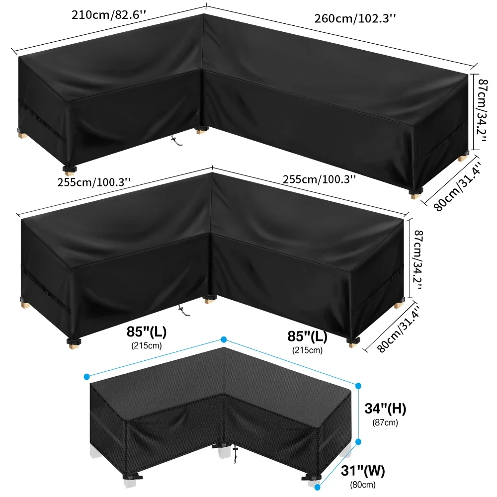 Enhance your outdoor furniture protection with this durable, waterproof cover designed specifically for L-shaped sectional sofas. Crafted from heavy-duty oxford fabric, it features a UV-stabilized coating and a waterproof laminated backing to ensure your furniture stays dry and protected in all weather conditions. The sleek black finish with woven texture and understated dotted pattern adds a modern, sophisticated touch to your outdoor space. Its custom-fit design contours precisely to the shape of your sectional, while the reinforced material offers resistance against abrasion and sun damage. Easy to install and remove, it includes padded handles, adjustable click-close straps, and a drawstring with toggles for a secure fit. Keep your lounge set pristine with this reliable, all-weather furniture cover.