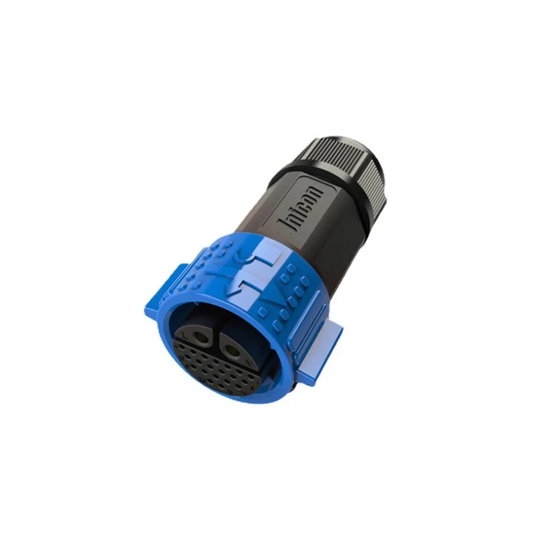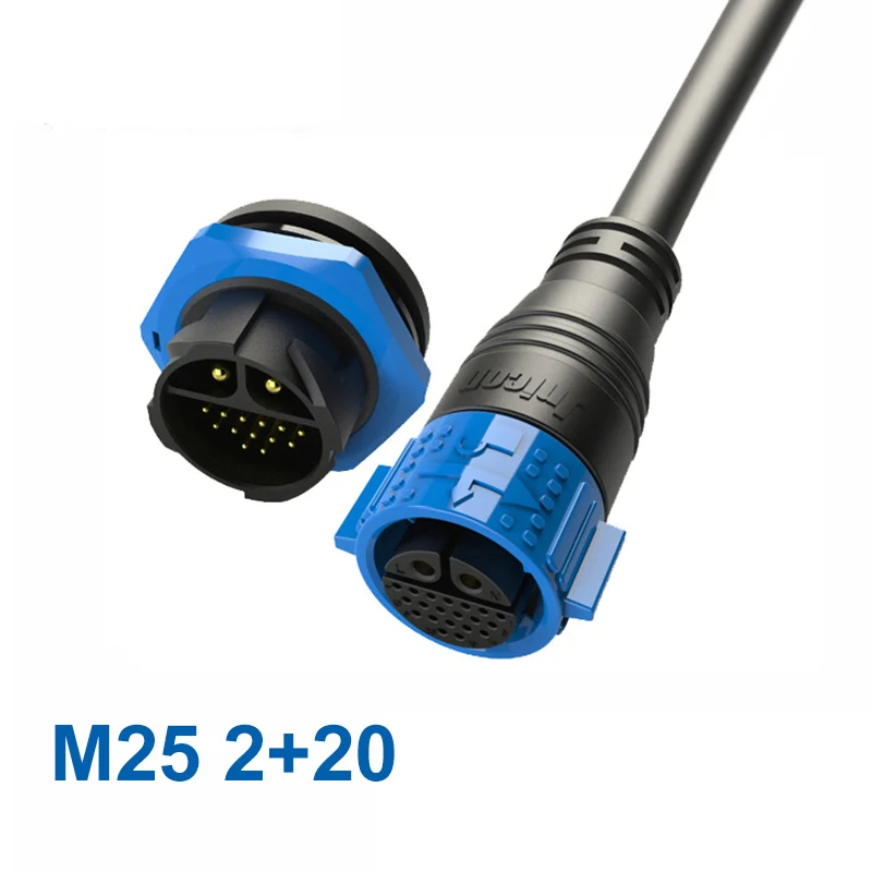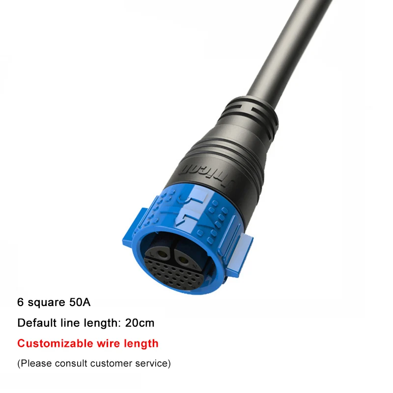 Experience reliable connectivity with this waterproof self-locking connector tailored for LED display screens. Crafted from high-performance engineering plastics, it offers exceptional durability and resistance to harsh outdoor conditions. Featuring a sleek, rugged design, this connector includes a 22-pin male and female joint with a textured grip surface and vibrant blue locking mechanisms for secure attachment. With an IP67 rating, it ensures water-tight and dust-proof performance even in challenging environments. The connector supports a rated current of 25A or 50A and a maximum voltage of 1500V, making it suitable for high-demand electrical applications. Its compact 20mm outer diameter and customizable line lengths provide flexible installation options, while its operating temperature range of -40°C to 105°C guarantees stability across diverse conditions.