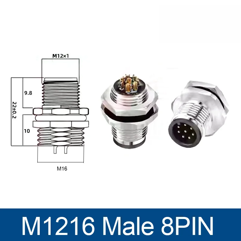 - This high-quality waterproof M12 connector features a shiny metallic surface with a polished, reflective finish to suit professional industrial environments.
