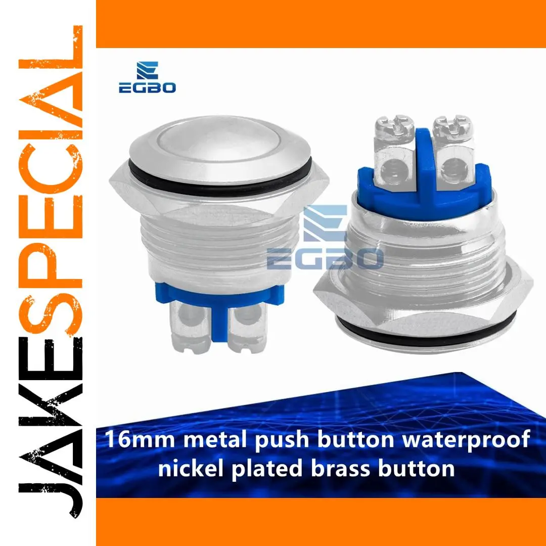 - Technical specifications: nickel-plated brass, 16mm diameter, high-profile design, momentary operation, single NO contact, waterproof sealing, temperature -40°C to 80°C.