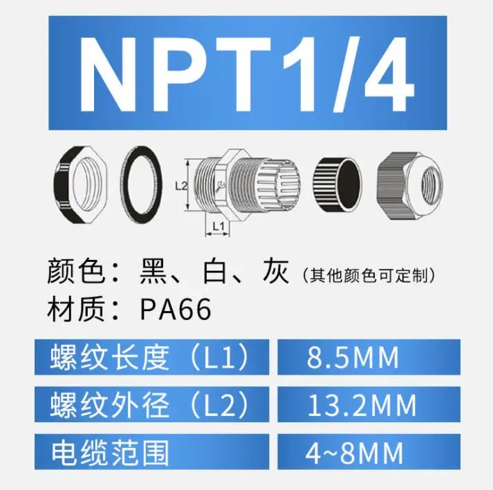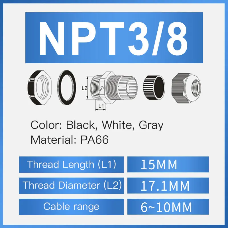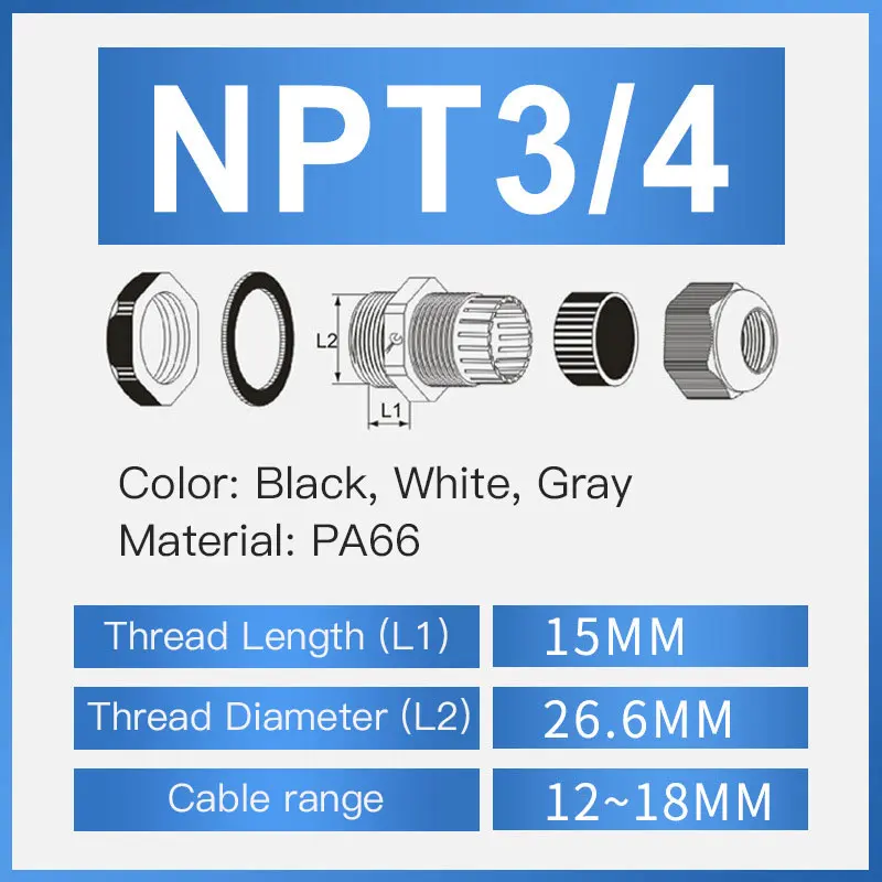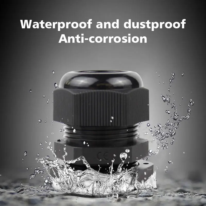 This set of 10 waterproof cable glands is crafted from durable nylon in black or white, designed to fit wire diameters of 4 to 25mm. Available in NPT sizes from 1/4 to 2″, including models like NPT 1/4, 3/8, 1/2, 3/4, 1, 1 1/4, 1 1/2, and 2″, these glands feature a secure screw connection and offer IP68 waterproof protection. They can withstand temperatures from -40°C to +100°C, making them ideal for junction boxes, control panels, and electrical devices requiring reliable sealing and corrosion resistance. Certified compliant with multiple standards, they ensure long-lasting performance in demanding environments.