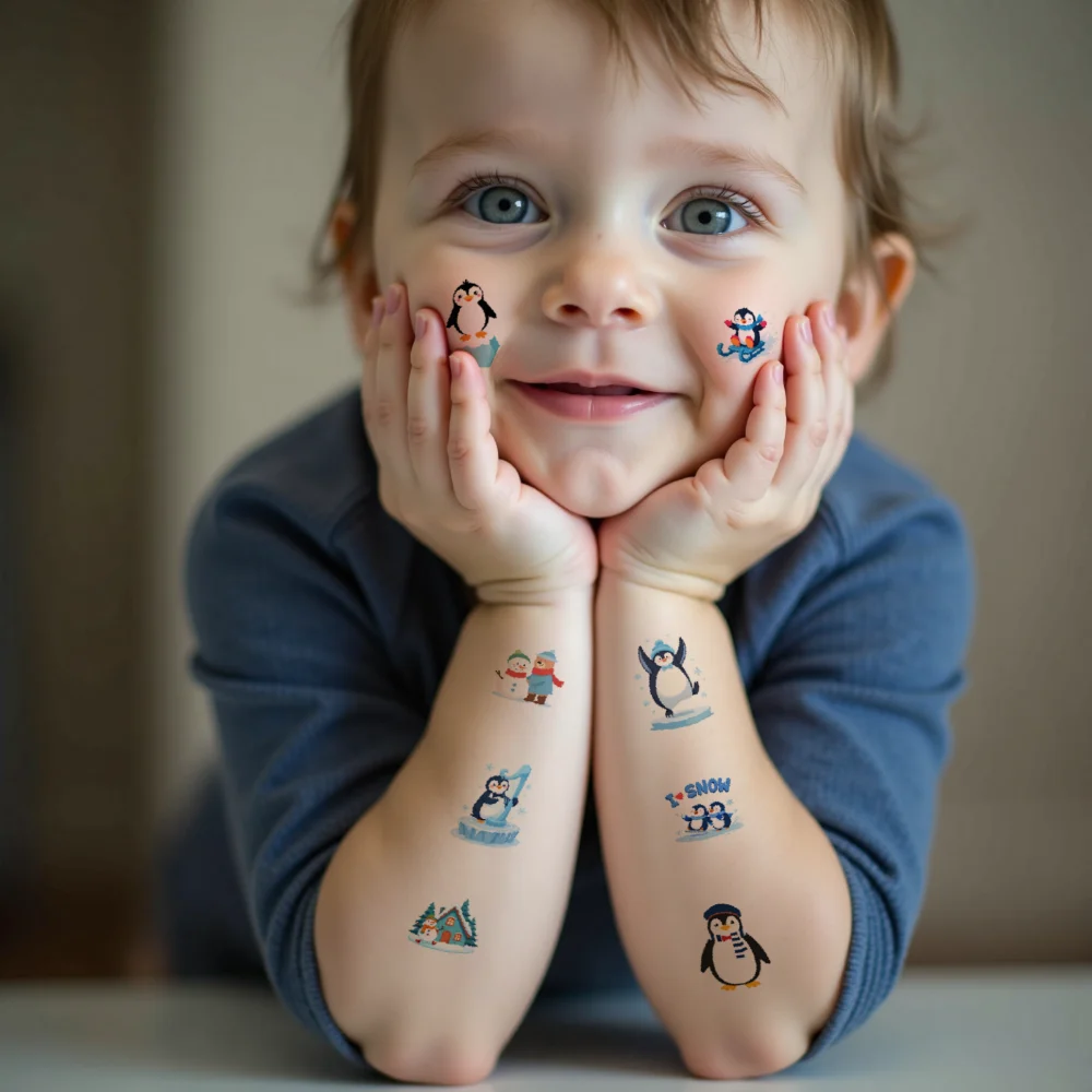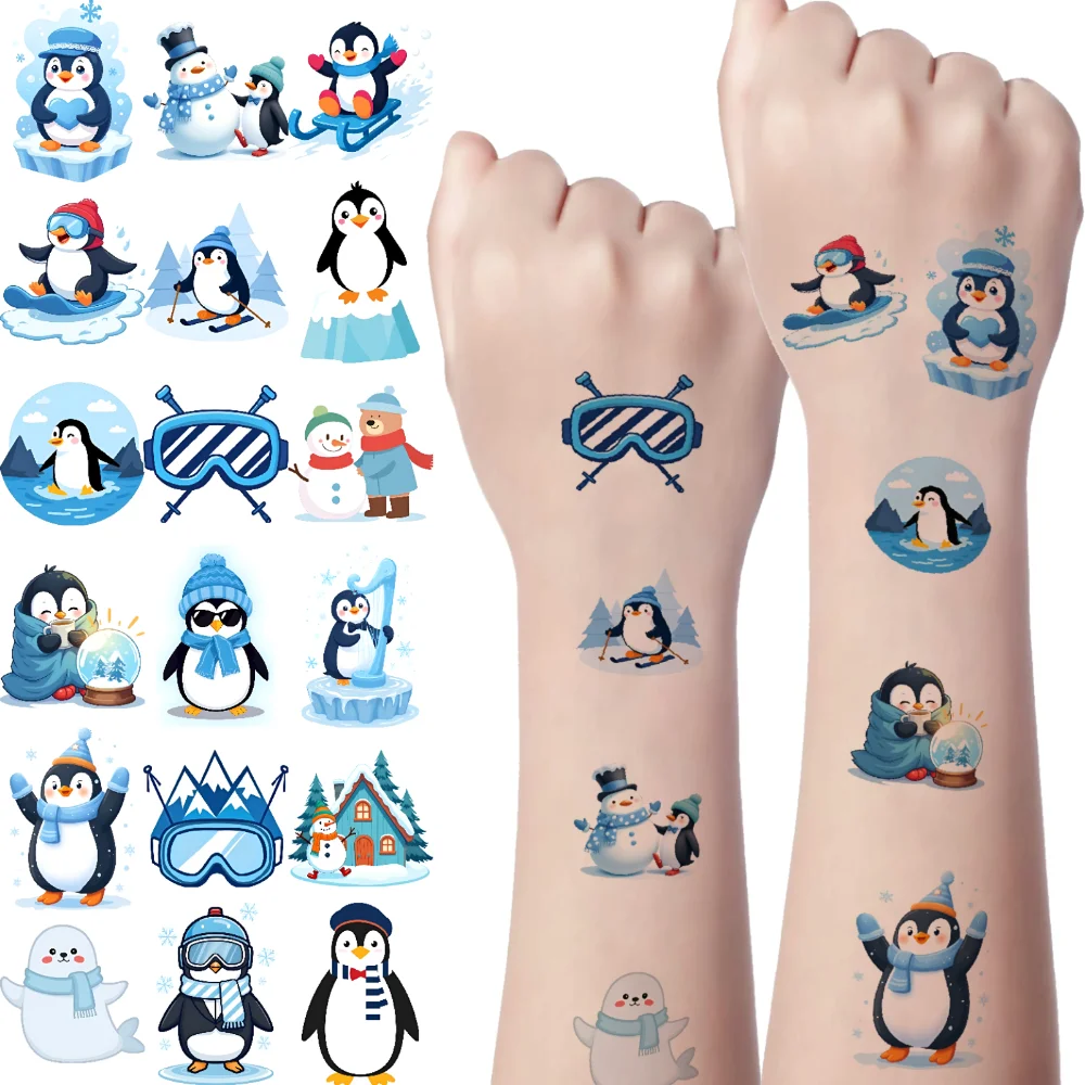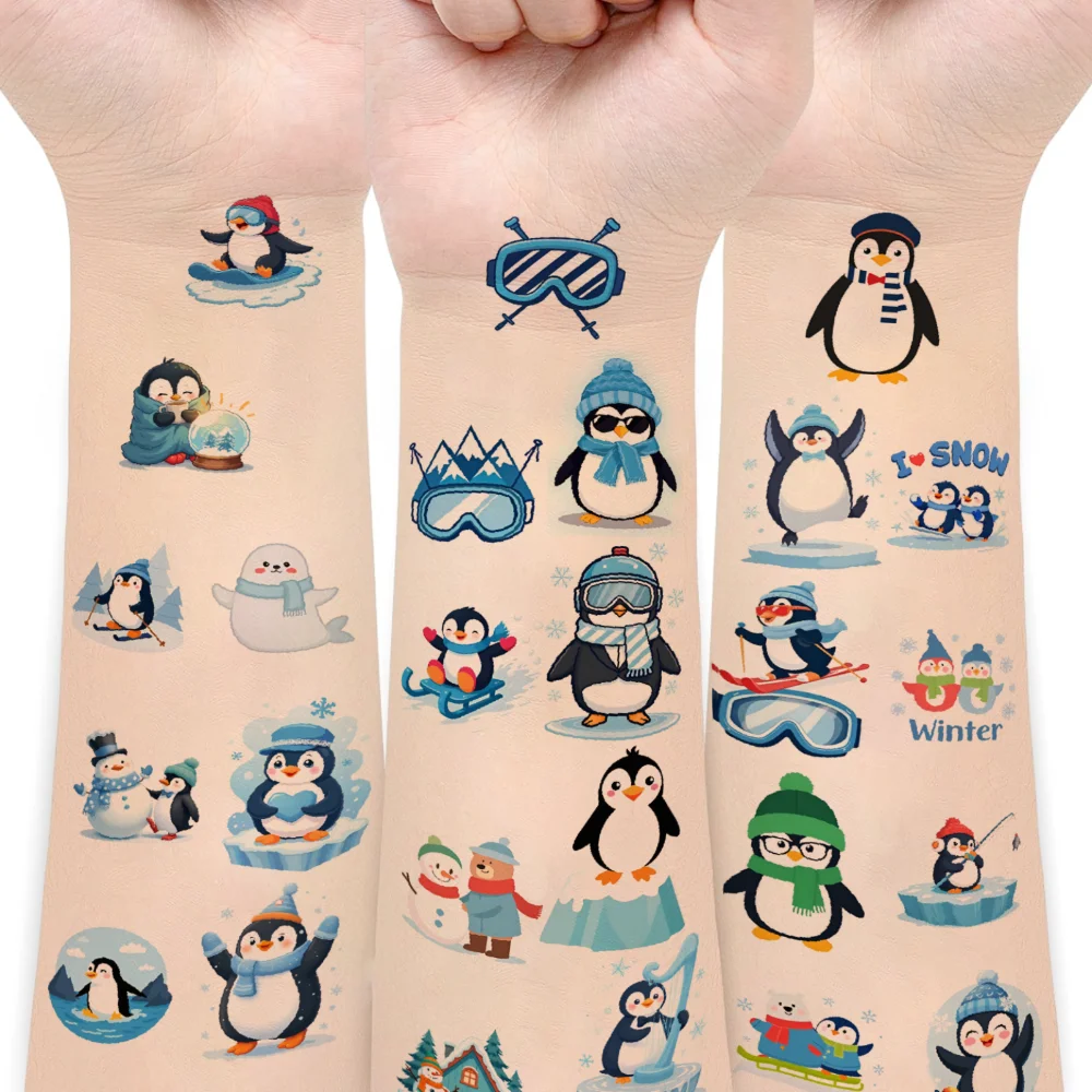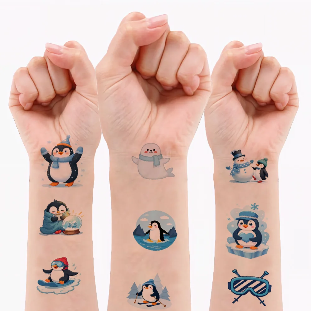 - Each tattoo measures approximately 1.5 x 3 cm, with vibrant, cartoon-style penguins dressed for winter, engaging in fun activities like ice skating, snowball fights, and holiday scenes.