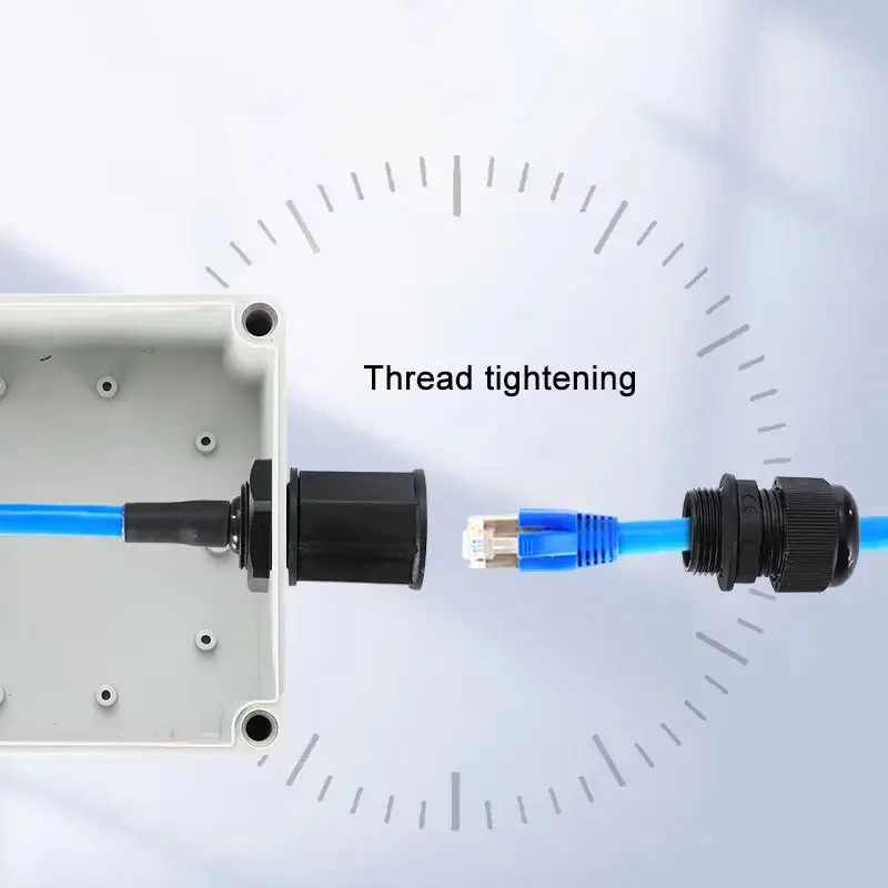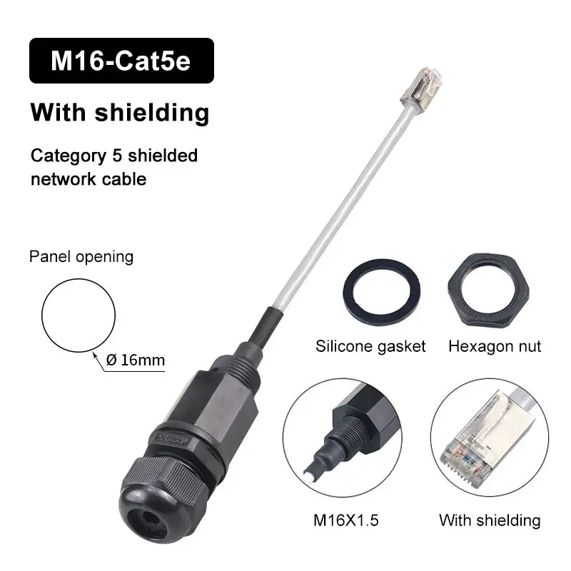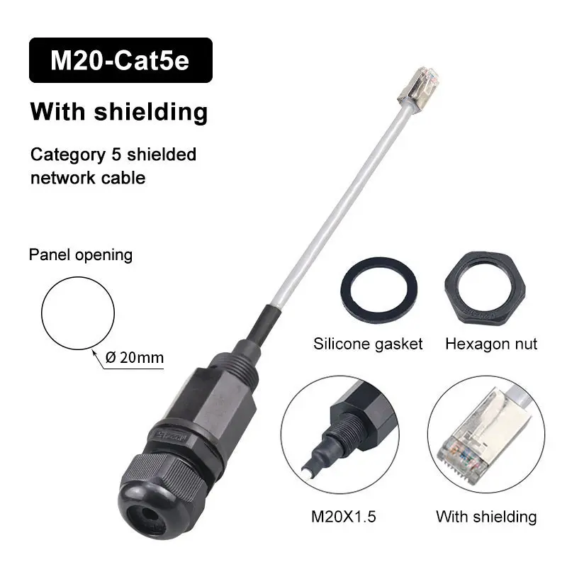 The waterproof RJ45 network connector features a durable nylon PA66 shell with models available in M16, M16 with shield, M20, M20 with shield, M20 with DC plug, M22, and M22 with shield options. It has a 25cm cable length, IP68 waterproof rating, and employs crimping and thread locking for secure connections. The connector contains 8 gold-plated pins rated for 125V and 1.5A, with a maximum operating temperature of -40°C to 105°C. Designed for outdoor use, it supports up to 3000 mating cycles and features CE and RoHS certifications, ensuring high performance, corrosion resistance, and long-term durability in demanding environments.