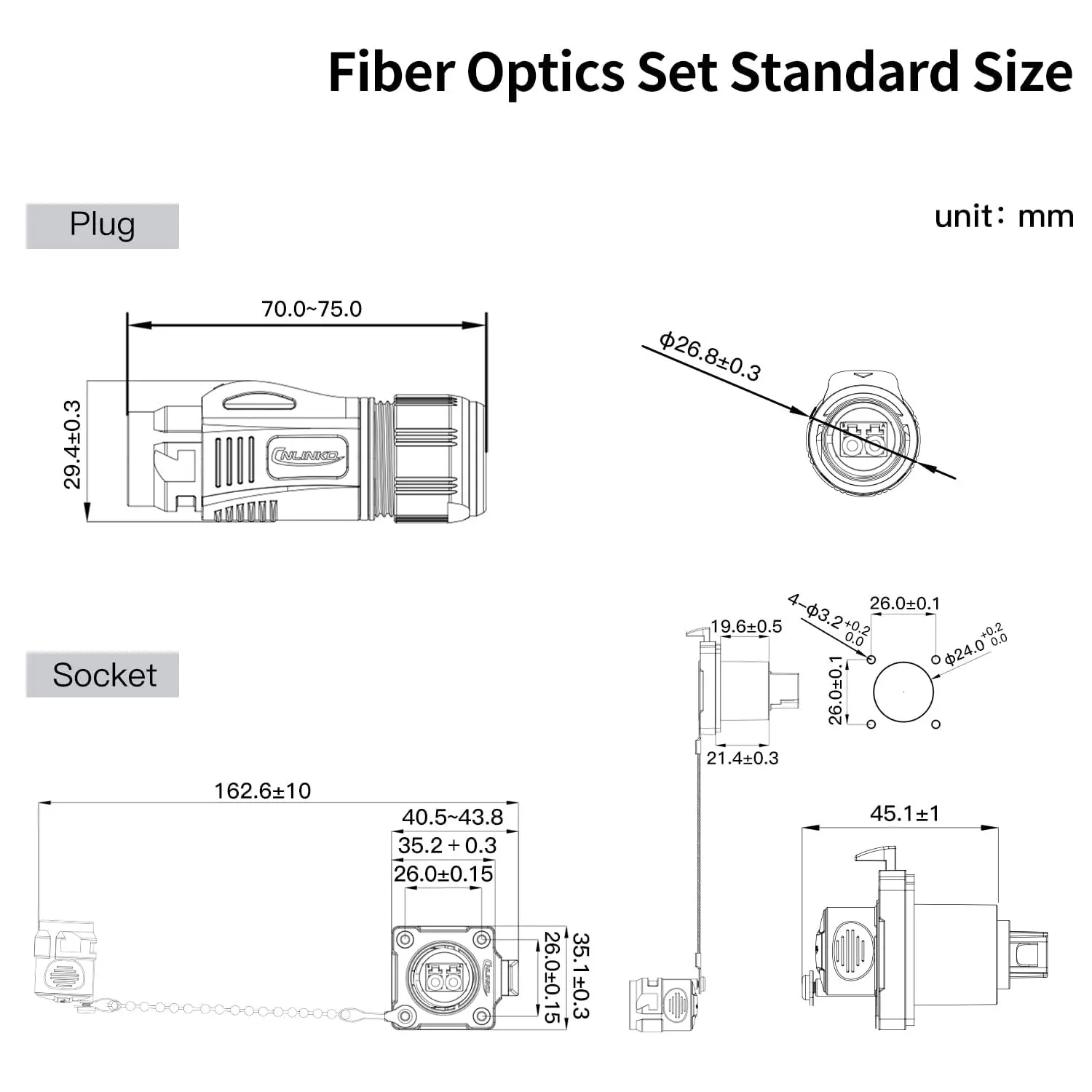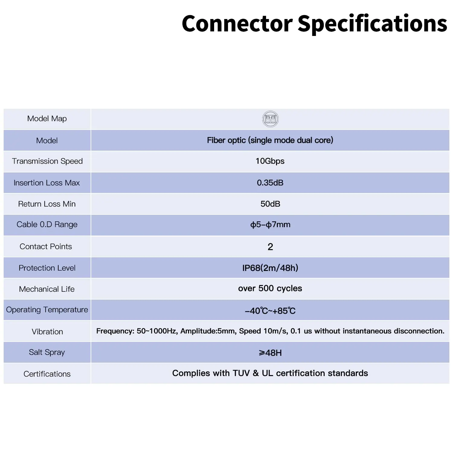 Experience reliable, high-precision data transmission with this durable, waterproof single-mode optical fiber connector made of zinc alloy. Featuring an IP68 protection level, it supports at least 500 connection cycles and employs a secure 1/4 bayonet connecting mode. The connector includes plug and socket configurations with extension cables available in lengths of 0.5m, 1m, 2m, and 3m, with up to 30m options, making it ideal for demanding environments. Constructed with high-performance engineering plastics and rated UL94-V0, it offers low signal loss and robust performance. Certified by CE, RoHS, UL, and TUV, this silver-colored connector guarantees long-lasting, reliable connections in professional applications.