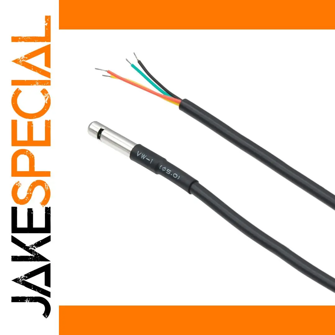 Enhance your environment monitoring with this sleek and durable waterproof stainless steel temperature and humidity sensor module. Its slender, cylindrical probe with a polished, reflective finish is designed for precision. The black segment near the base, with crisp white text, adds a touch of industrial elegance, blending style and functionality. The flexible black cable extends comfortably, featuring color-coded exposed wires—yellow, red, orange, black, and greenish-blue—that allow easy integration into your system. With support for models AHT10, AHT20, and AHT30, and options for 1-meter, 2-meter, or 3-meter cable lengths, this sensor offers versatility. Its waterproof construction ensures resilience in harsh environments, making it ideal for both indoor and outdoor applications requiring accurate humidity and temperature measurement.