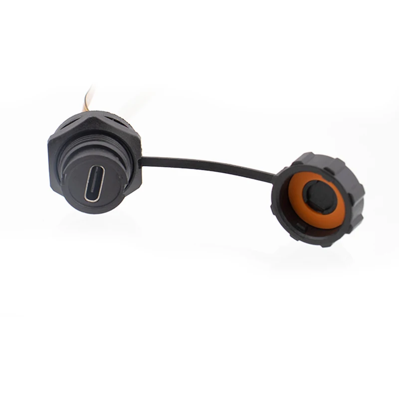 Experience reliable connectivity with this industrial-grade waterproof Type-C FPC connector, rated IP68 for dust and water resistance. Designed for demanding environments, it offers a durable black cylindrical body with a textured, grooved surface for easy grip and secure installation. Choose between a threaded or snap-on sealing mechanism, with dust cover options in multiple styles (Cover-A, Cover-B, Cover-C, Cover-D) and cable lengths of 10 cm or 20 cm, or opt for no wire. Supporting USB 3.1 Type-C specifications, it operates within a voltage range of 1V to 12V, with customizable voltages, ensuring versatile power and data transfer in industrial applications.