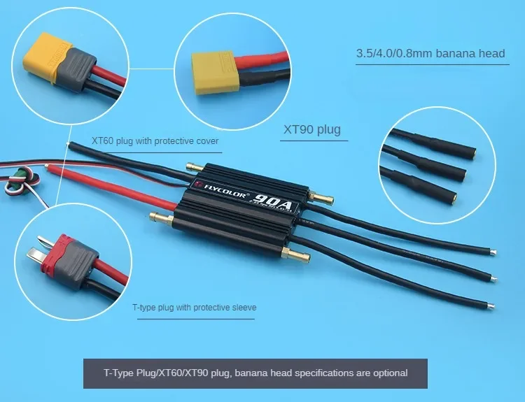 - Compatible with various motor connectors matching different configurations, including T-type, XT90, and XT60 plugs, suitable for boats up to 135cm in length, supporting maximum burst currents up to 900A for short durations.