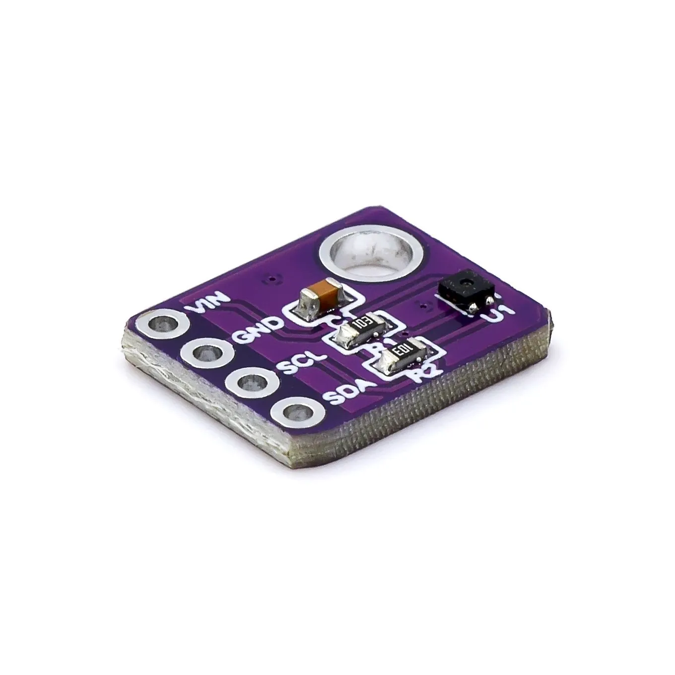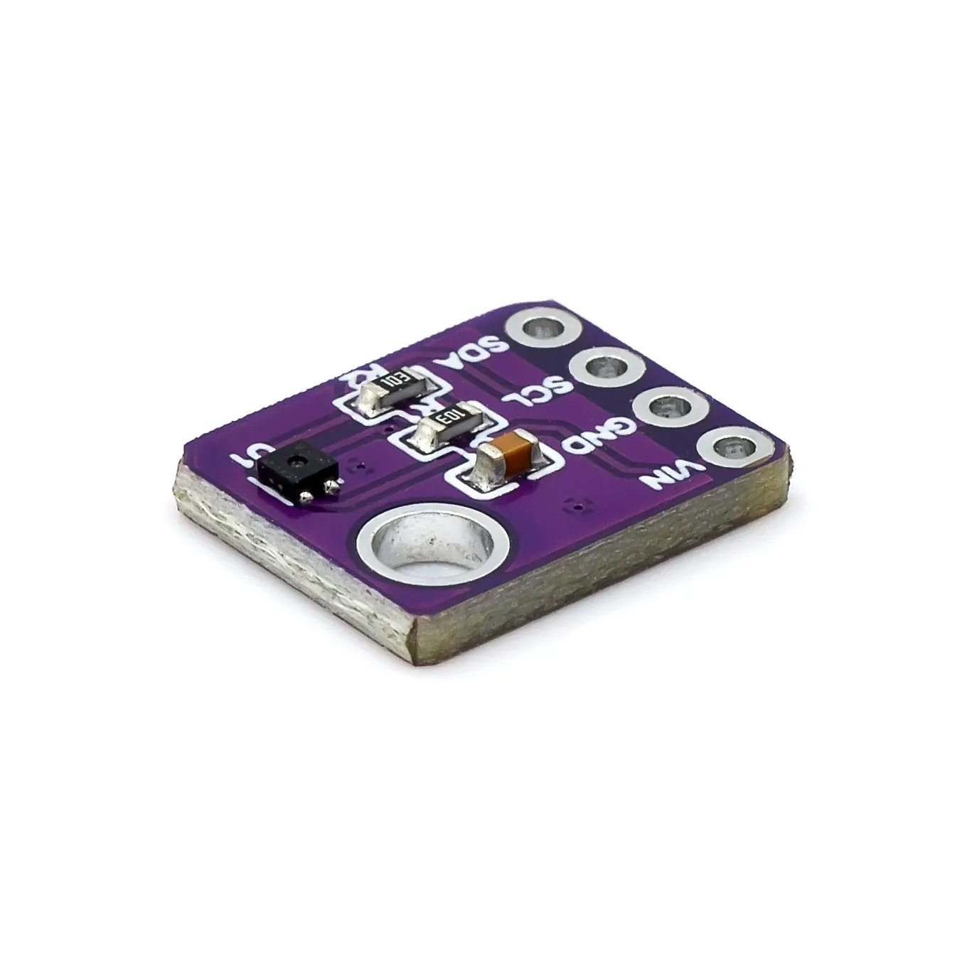 Experience precise environmental monitoring with this compact, purple-colored SHT40-D Temperature and Humidity Sensor Breakout by MINGYUANDINGYE. Designed for seamless integration, it operates at a 5V supply voltage with a minimal power dissipation of 1W. The sleek, rectangular circuit board features a matte purple surface with white labels indicating connection points: VCC, GND, SCL, and SDA. Equipped with fine traces, surface-mounted components, and a metallic mounting hole for secure attachment, it combines technical elegance with industrial robustness. Ideal for weather stations, environmental sensors, and embedded projects, this sensor offers reliable readings up to 85°C and blends modern aesthetics with professional functionality.