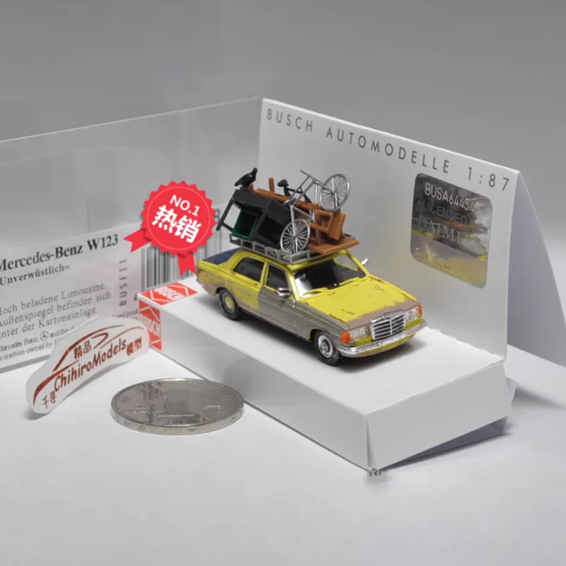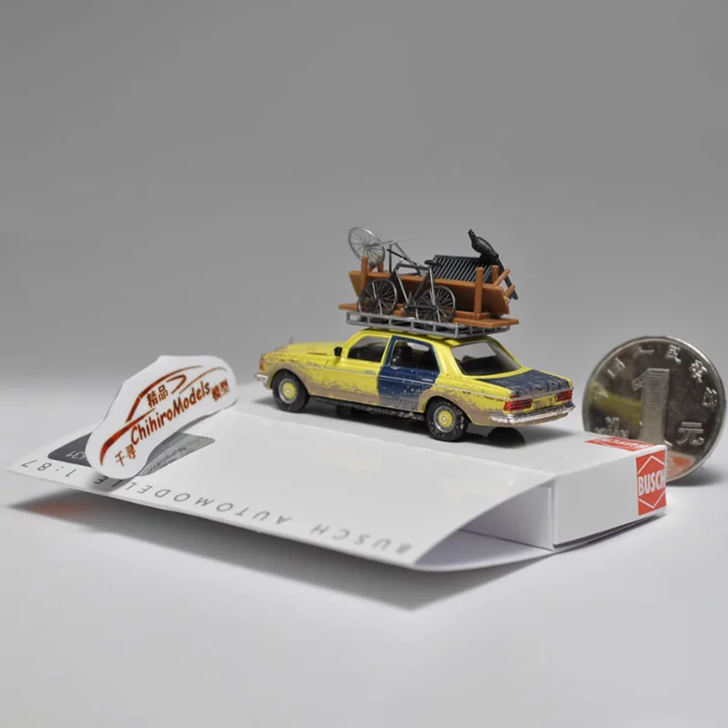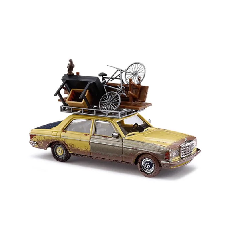 Experience the charm of vintage ruggedness with this detailed miniature of a classic Mercedes-Benz W123. Crafted with fine plastic and alloy parts, this 1:87 scale model embodies a weathered, dirt-version finish, giving it a nostalgic, well-used appearance. Its yellow body features realistic rust, dirt, and wear marks, highlighting the model’s vintage and rustic appeal. The vehicle boasts clear windows, side mirrors, and tiny silver hubcaps on black tires, enhancing its authentic look. The model's roof rack is metallic-looking and holds miniature accessories like luggage, a bicycle, a crate, and a figurine, making it a captivating display piece. Designed for collectors, hobbyists, and enthusiasts, it offers a nostalgic vibe with its rugged, aged aesthetic.