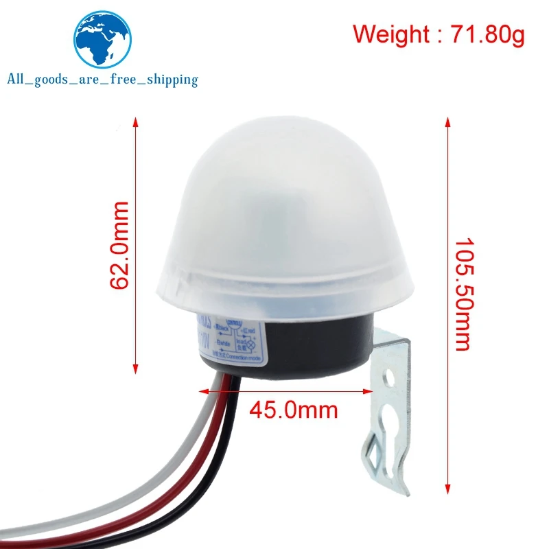Experience seamless, automatic control of outdoor LED lighting with this waterproof, auto photo-sensitive switch module. Designed to adapt effortlessly to your street lighting setup, it features a sleek, cylindrical design with a smooth white semi-spherical dome that protects the internal photocell from weather elements. The black cylindrical body houses sensitive electronics, ensuring reliable operation in various outdoor conditions. The durable metallic mounting bracket allows secure installation onto poles or surfaces, while the three exposed wires—red, white, and black—provide easy wiring connection. With a rated capacity of 10A and compatibility with DC 12V, AC 110V, and AC 220V power supplies, this module offers efficient, energy-saving lighting control. Its weather-resistant design guarantees longevity and consistent performance.
