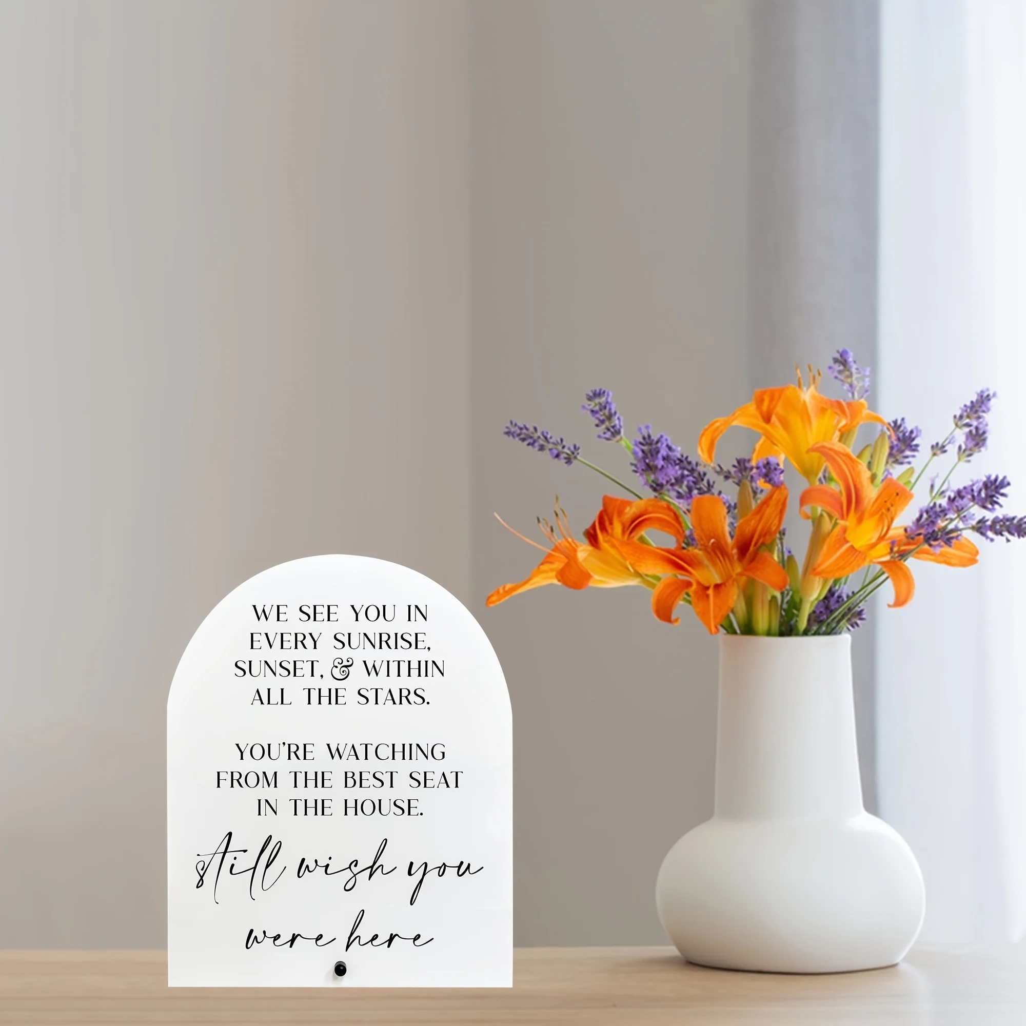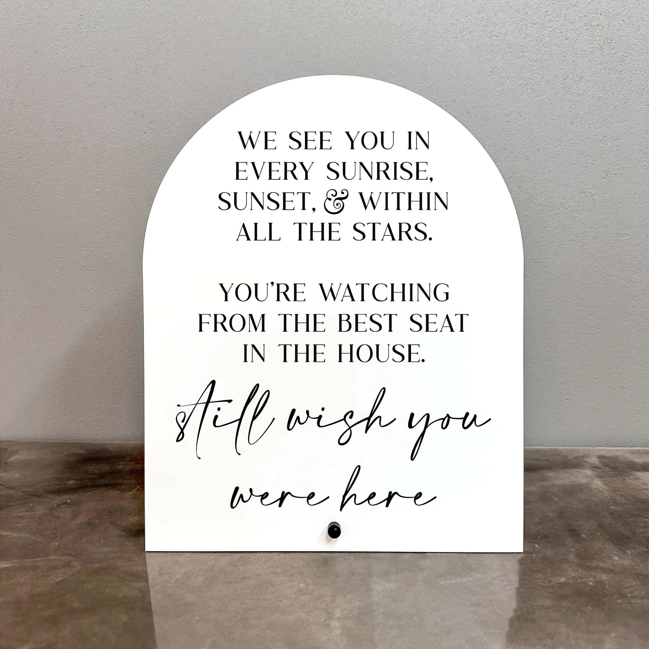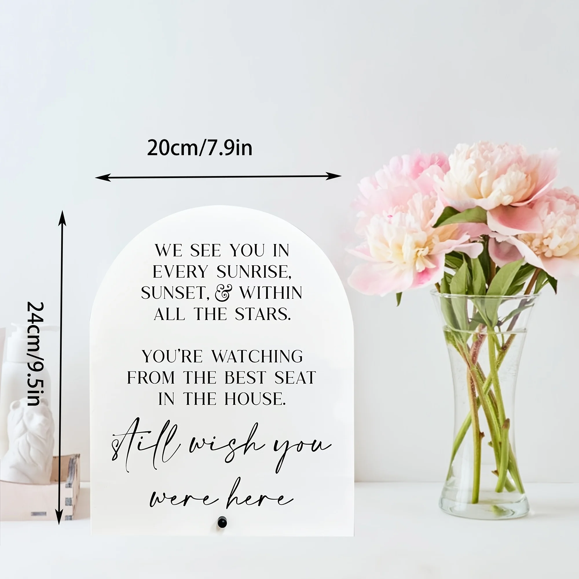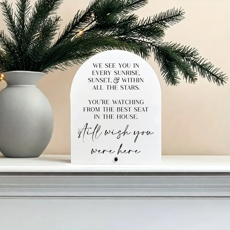 Bring a heartfelt touch to your special day with this beautiful wedding memorial acrylic sign. Crafted from durable, glossy white plastic, this sign features a sleek, arched top design that exudes simplicity and elegance. Its clean lines and minimalist style create a calming atmosphere, perfect for honoring loved ones. The centrally printed black text combines bold uppercase and flowing lowercase script, enhancing visual interest and emotional depth. Lightweight yet sturdy, it’s easy to mount on your wall or display on a stand. Ideal for creating a warm, memorable environment, this sign allows you to pay tribute to cherished memories during your wedding or special event. Its timeless design ensures it fits seamlessly into any decor style.