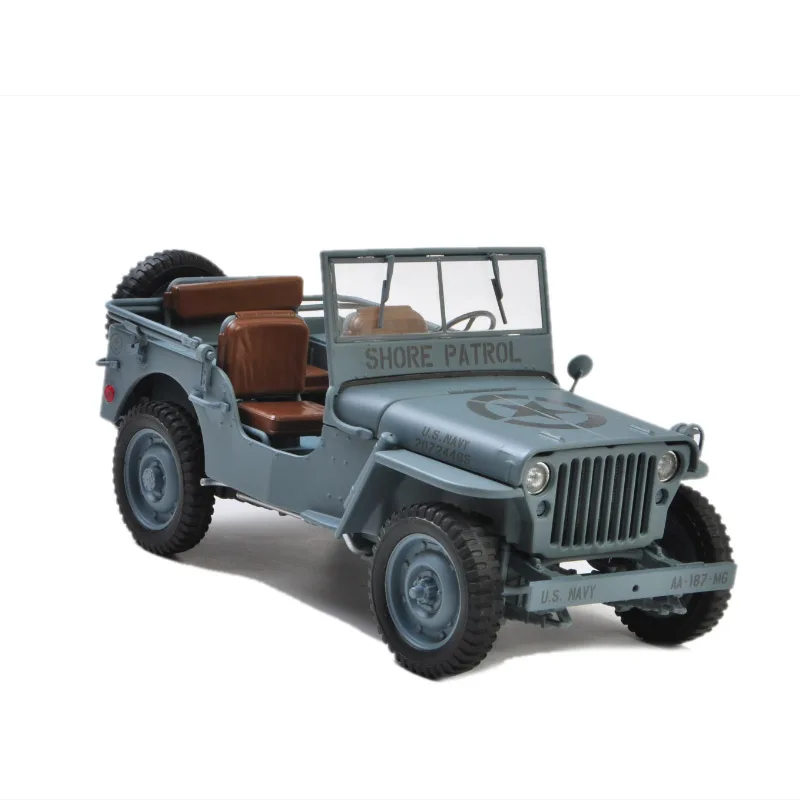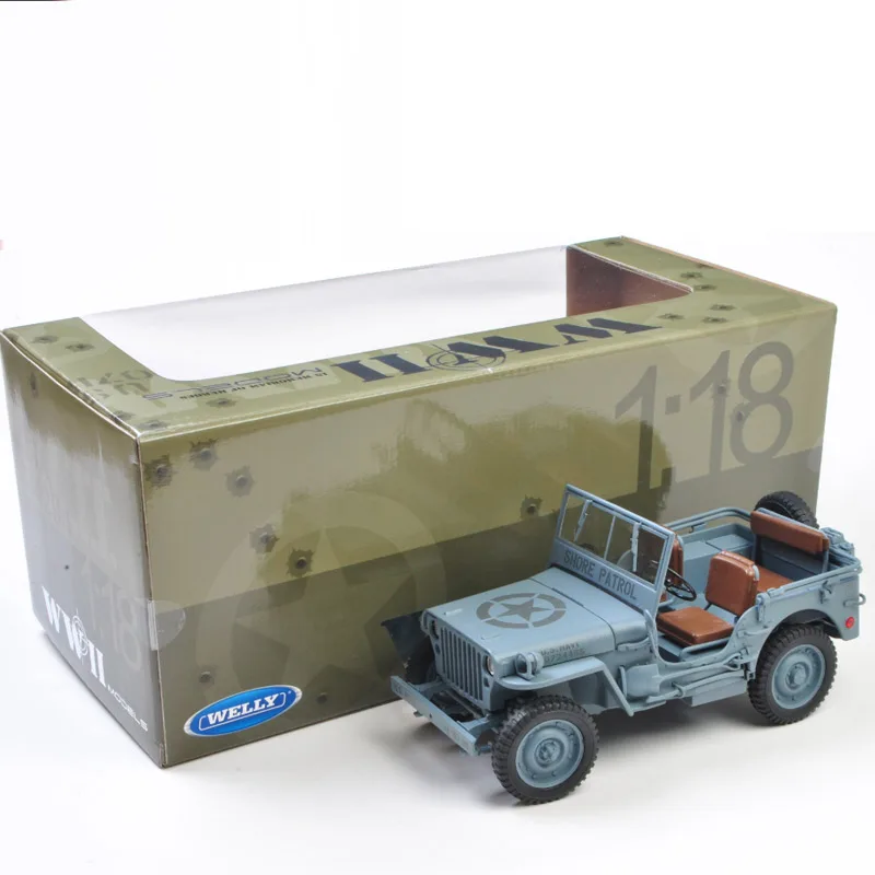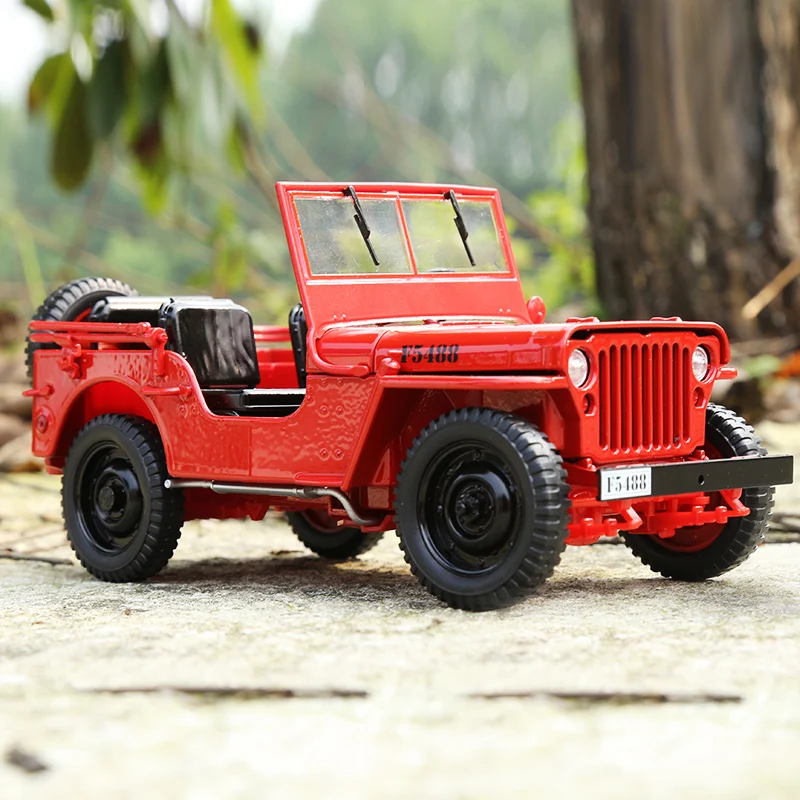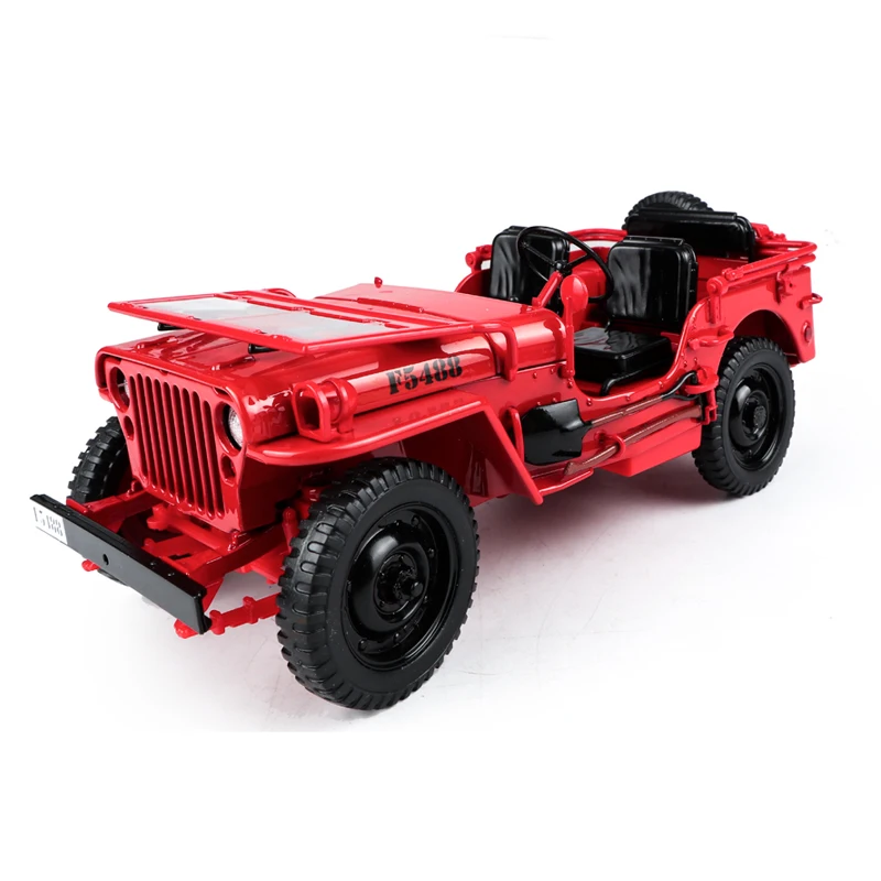 Experience the charm of classic military vehicles with the WELLY 1:18 Willys Jeep die-cast model. This meticulously detailed model showcases a vibrant high-gloss red finish, capturing attention with its rugged, boxy design and smooth lines. Crafted from durable zinc alloy, it features black plastic wheels with intricate tread patterns, adding realism to its robust appearance. The model allows for interactive enjoyment, with both front doors and the hood opening to reveal a well-crafted interior, complete with a steering wheel. Measuring approximately 18 cm in length, 9 cm in width, and 10.5 cm in height, it makes a striking addition to any collector’s display.
