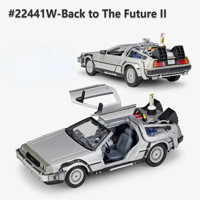 - Technical specifications include alloy metal construction, detailed panel lines, vents, authentic grille with “DMC” logo, and precise exterior proportions that faithfully replicate the original DeLorean DMC-12 from the “Back to the Future” franchise.