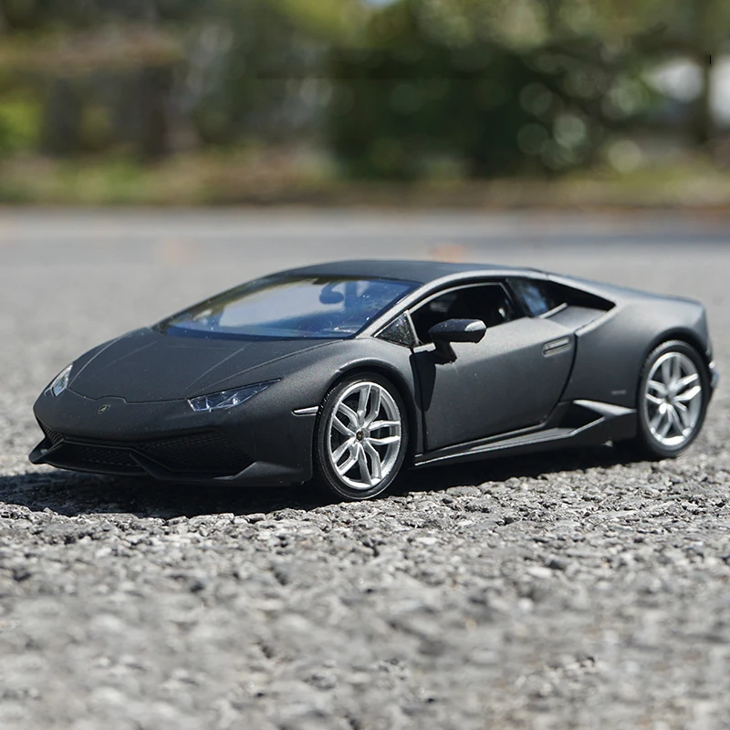 The WELLY 1:24 Lamborghini Huracan LP610-4 diecast model car boasts a sophisticated matte black finish, showcasing its sleek and aerodynamic design. Crafted from alloy and plastic, this collectible features intricately detailed headlights with clear plastic lenses, prominent five-spoke alloy wheels fitted with rubber-like tires, and functional doors that reveal a well-crafted interior. The model captures the signature tail lights and exhaust setup of the Huracan series, making it an eye-catching display piece. With a scale of 1:24, this non-operational model emphasizes its role as a collector’s item, available in additional colors: Yellow and White.
