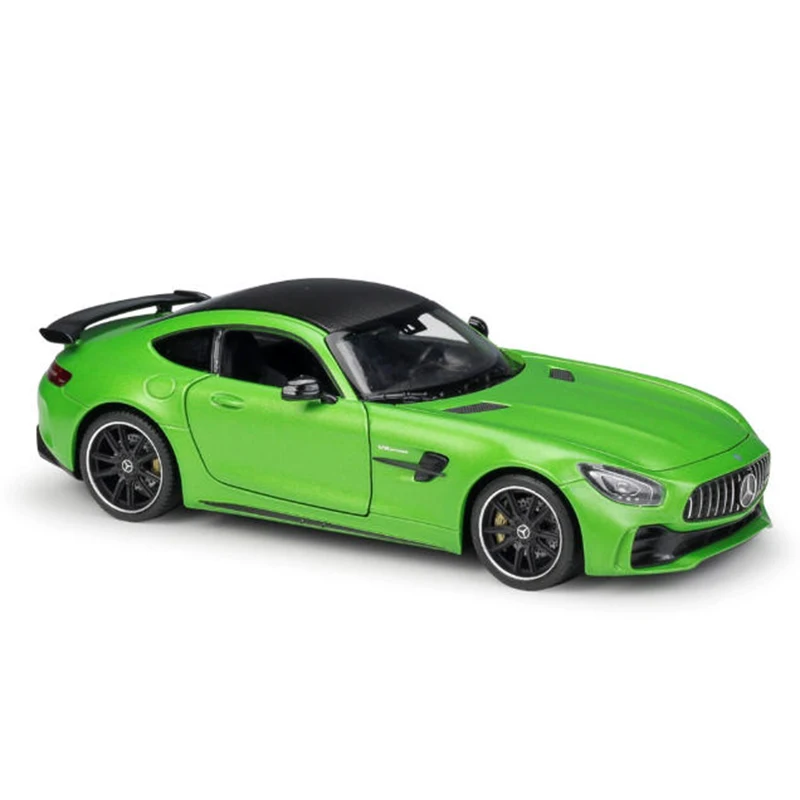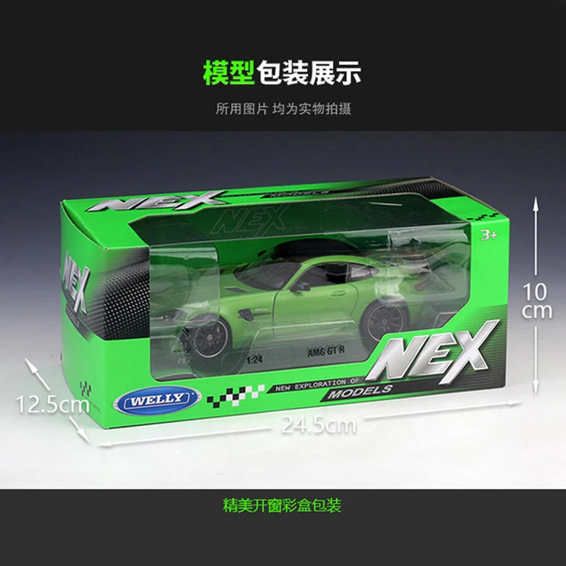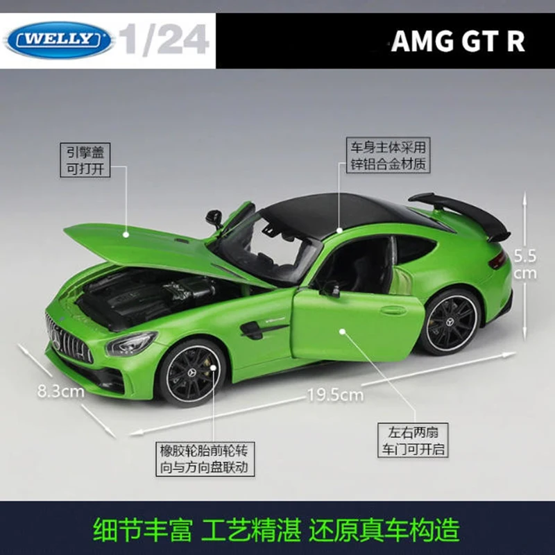 The WELLY 1:24 scale AMG GT R diecast alloy car model is the perfect addition to any collection, offering stunning details and vibrant colors. Available in bright green, striking red, and bold yellow, each model features a sleek design and a contrasting black roof that enhances its sporty appeal. Intricate details, such as finely crafted front grilles, meticulously designed headlights, and expressive wheel patterns, replicate the real car's beauty. This model measures approximately 19.5 cm in length, 8.3 cm in width, and 5.5 cm in height, perfectly sized for display or as a unique gift for car enthusiasts.