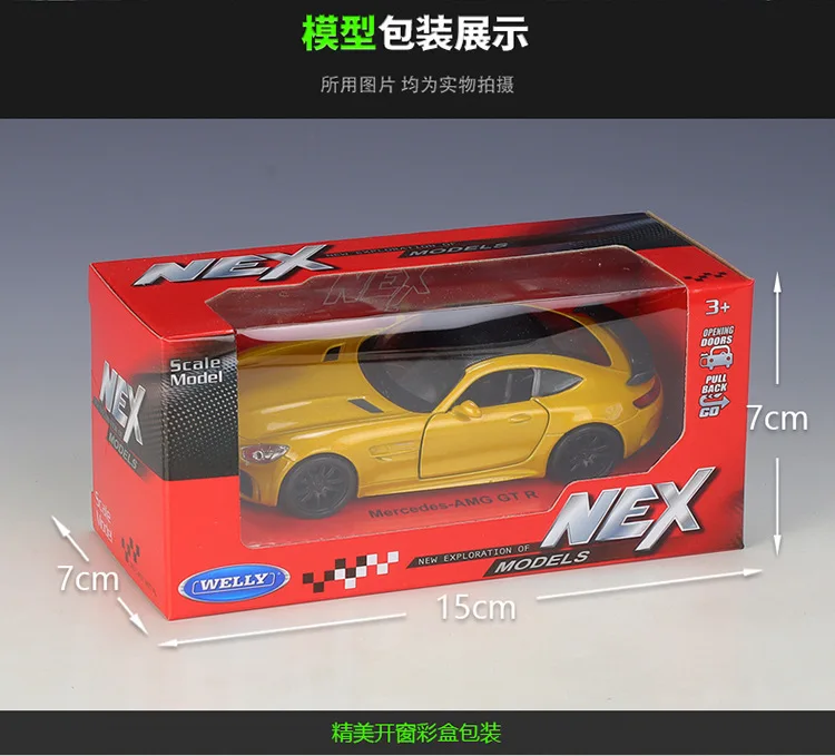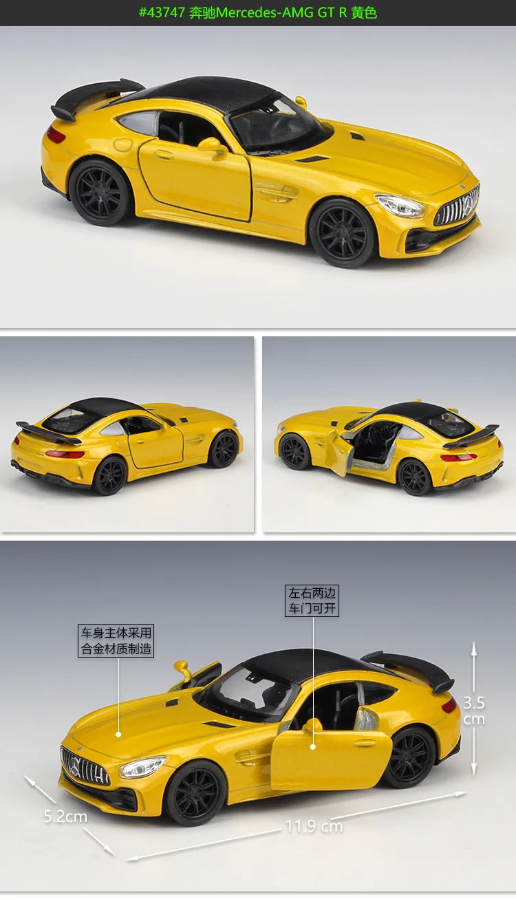 Experience the thrill of high-performance with this detailed 1:36 scale diecast alloy model of the Mercedes-AMG GT R by WELLY. Featuring a vibrant yellow body, sleek aerodynamic profile, and contrasting textured black carbon fiber-style roof, this replica captures the essence of the original car’s sporty design. Precise detailing includes a distinctive vertical-slat grille, molded headlights, side air vents, sculpted body lines, and matching yellow side mirrors. The black multi-spoke wheels with textured tires add to its dynamic stance, while the prominent rear spoiler emphasizes its high-performance character. Crafted for collectors and enthusiasts, this robust model is perfect as a gift or display piece.