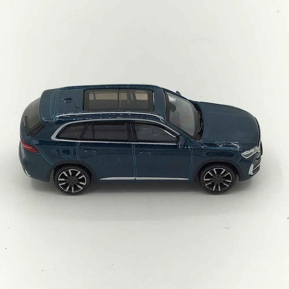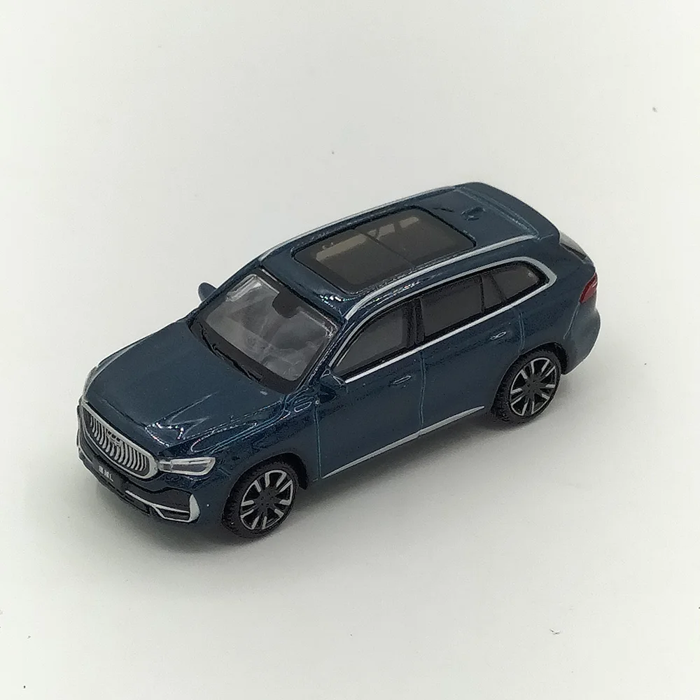 This 1:64 scale die-cast alloy off-road SUV model measures approximately 7.5 x 3 x 2.5 cm, featuring a sleek dark blue exterior with detailed design elements, including a prominent chrome grille, inset headlights, tinted windows, and multi-spoke metallic silver rims. Made from alloy, plastic, and rubber, it sports four movable rubber tires and a flat roof with a darker inset sunroof or panoramic glass panel. This non-functional, static collectible is perfect for display, gifting, or collection, designed for ages 14 and up, and comes in a stylish color box. An ideal addition for enthusiasts seeking realistic miniature automotive models.