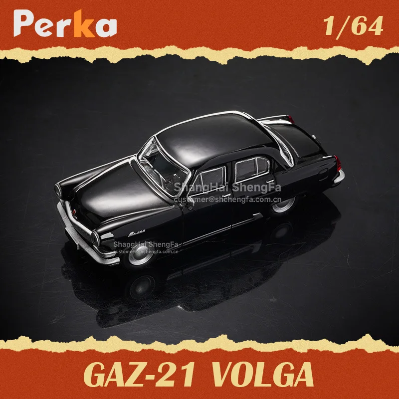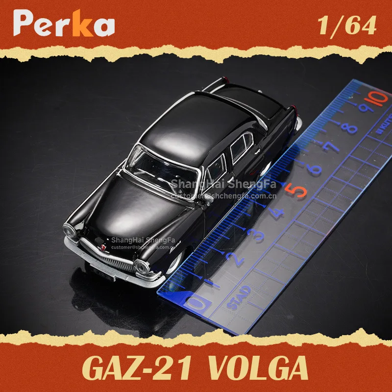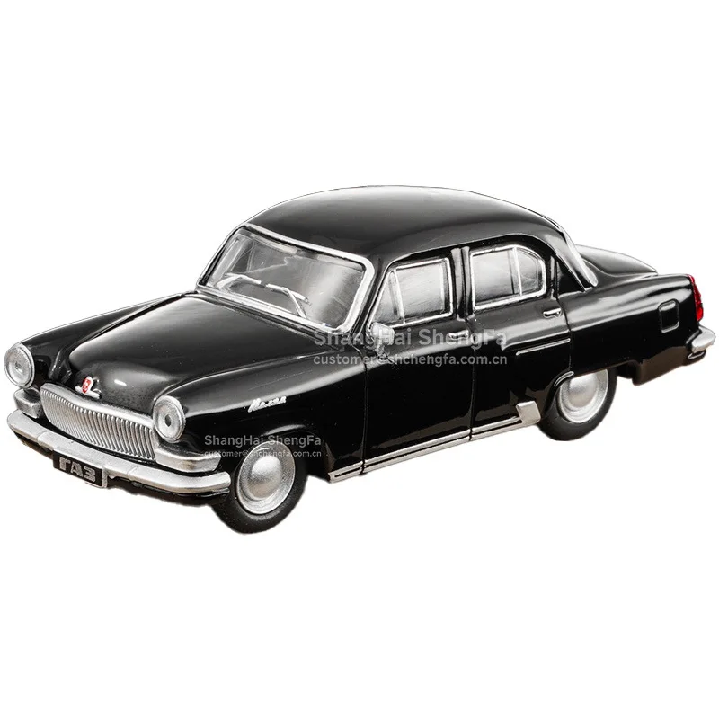 Enhance your collection with this highly detailed WELLY GAZ-21 Volga 1:64 diecast model, crafted from durable metal with a sleek, glossy black finish that accentuates its smooth, rounded vintage contours. It features a distinctive front grille with vertical chrome slats, precisely detailed round headlights with tiny light accents, and realistic wheels with silver hubcaps and treaded black tires. The rear displays detailed taillights, a small chrome bumper, and subtly recessed panels on the doors, trunk, and hood, creating an authentic, timeless aesthetic. Perfect for display, this meticulously crafted model captures the elegance and craftsmanship of the classic GAZ-21 Volga.