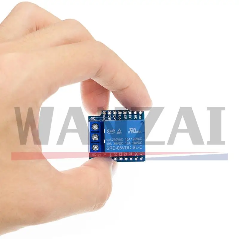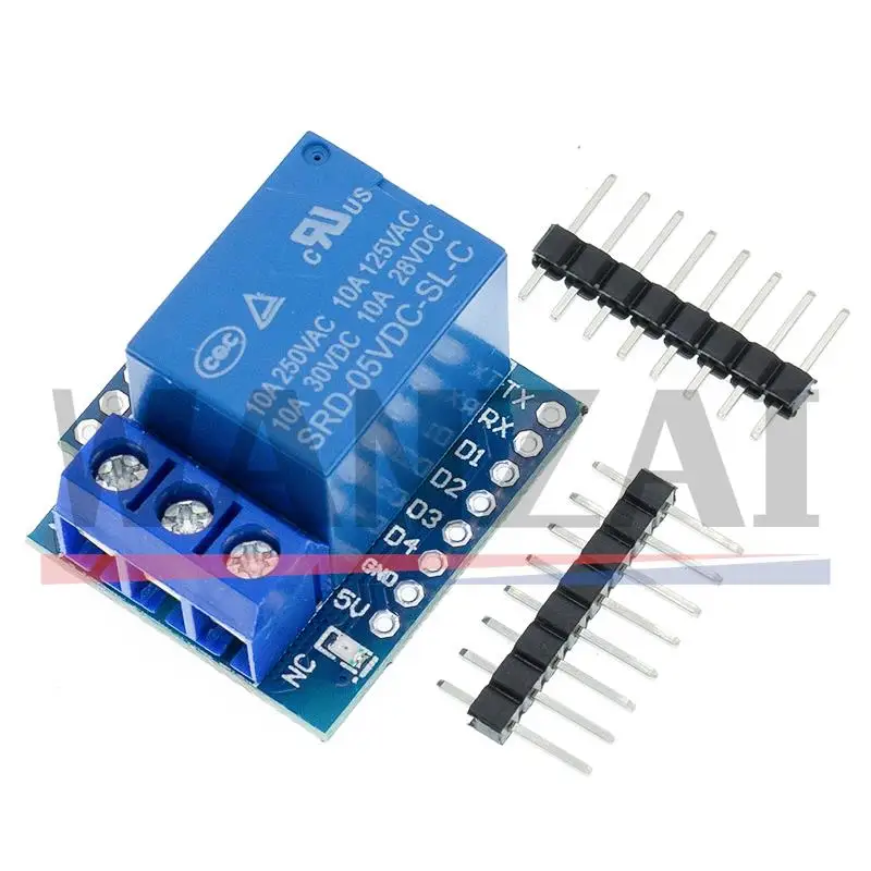 Transform your electronic projects with this sleek, one-channel Wemos D1 Mini relay shield designed specifically for ESP8266 development boards. Featuring a vibrant blue circuit board, this module combines minimalist aesthetics with functional engineering. Located centrally is a prominent blue relay with crisp white printed specifications, creating a clear focal point. Black pin headers with a matte finish extend outward on both sides, providing clean, organized connection points for jumper wires and peripherals. The bottom hosts three durable metallic screw terminals labeled NO, NC, and COM, making wiring straightforward and secure. Its compact, rectangular design ensures easy integration into your setup, all while offering reliable switching capabilities. Its professional appearance and solid construction make it ideal for custom control applications in home automation, IoT, and electronic prototypes.
