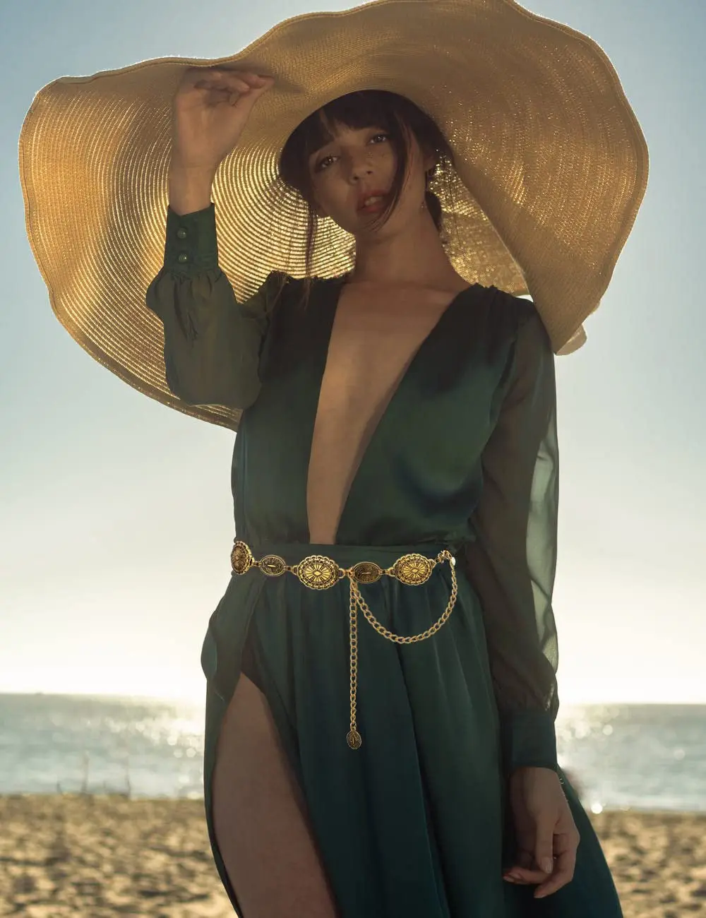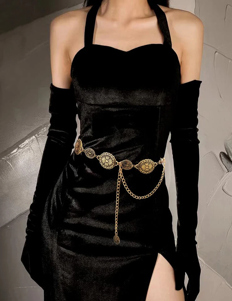 - Technical specifications include a belt length of 105 cm, made from high-quality metal with a polished finish, available in gold and silver, compatible with various outfits and styles.