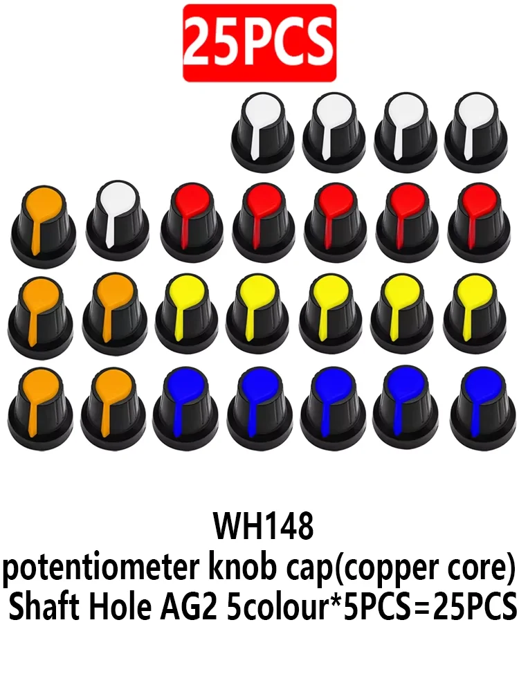 Enhance your workspace with these versatile and colorful potentiometer knobs. They’re not just functional; they add a sleek, modern look to your devices, making adjustments easier and more accurate. Whether you’re fine-tuning sensors or upgrading your switch modules, this set provides the variety, durability, and style you need. Invest in quality components that will help you create more professional, reliable, and visually appealing electronic setups. Don't wait—your next project deserves the best, and this set of WH148 knobs delivers just that.