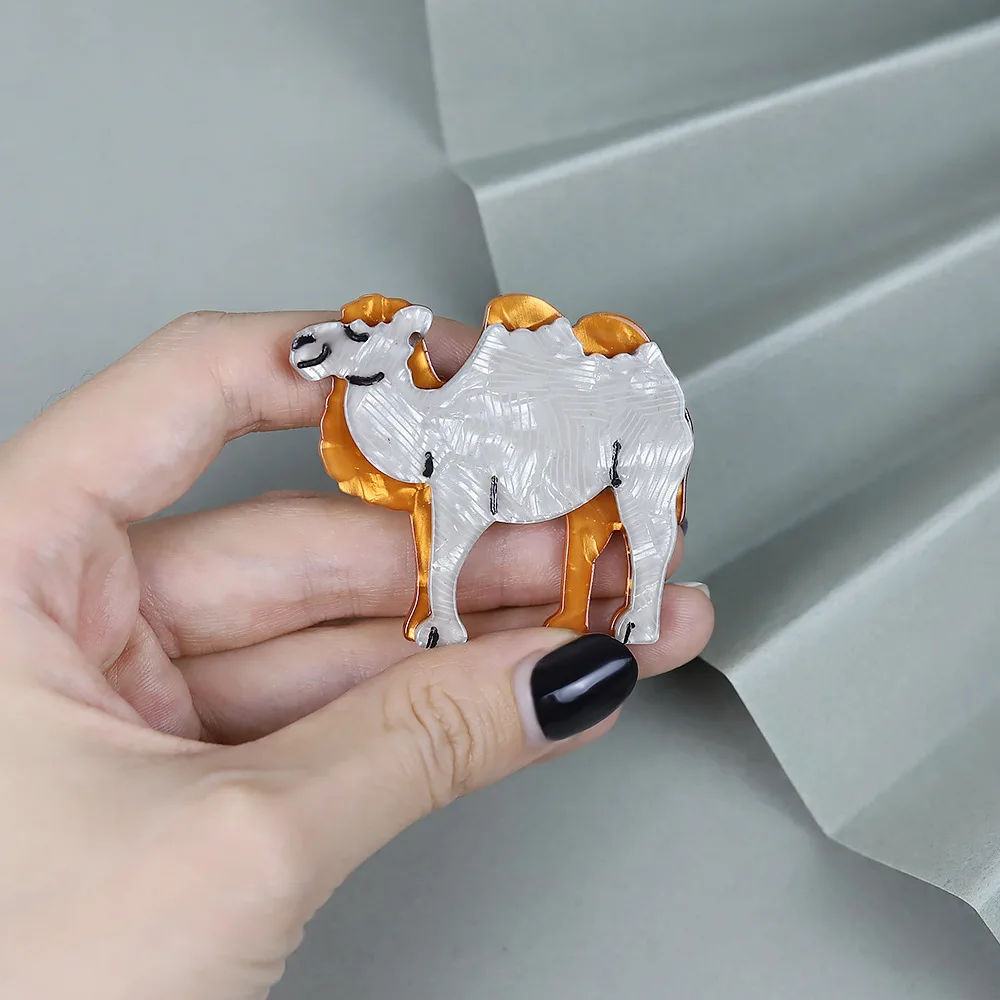 Imagine adding a touch of playful charm to your outfit with this adorable acrylic double-humped camel pin. Its playful cartoon style and smooth, rounded contours make it a versatile accessory for jackets, backpacks, hats, or DIY clothing projects. The shiny, pearlescent white surface with iridescent shine catches the light beautifully, while the glossy brown humps provide a charming contrast. The minimalistic face, with closed eyes and a gentle smile, exudes friendliness and a whimsical personality. Measuring approximately 4.2 cm in height and 5 cm in width, this pin is lightweight and easy to wear, perfectly suited to express your fun-loving personality. Its high-quality acrylic material ensures durability and a luminous finish, making it an ideal gift or personal accessory.