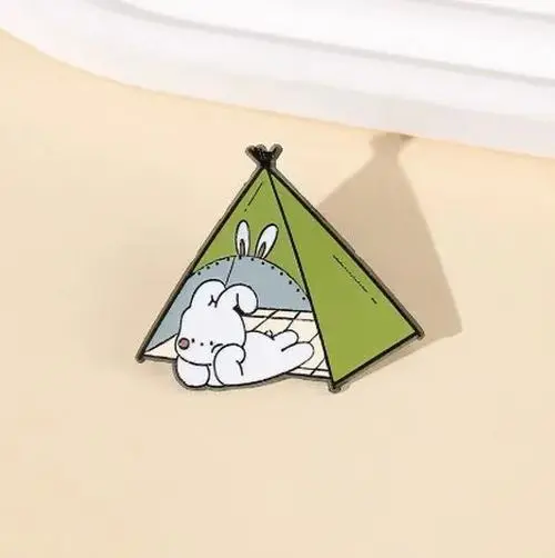 - Features playful cartoon bunny characters with cute, expressive faces, showcasing outdoor camping and leisure activities in detailed enamel design.