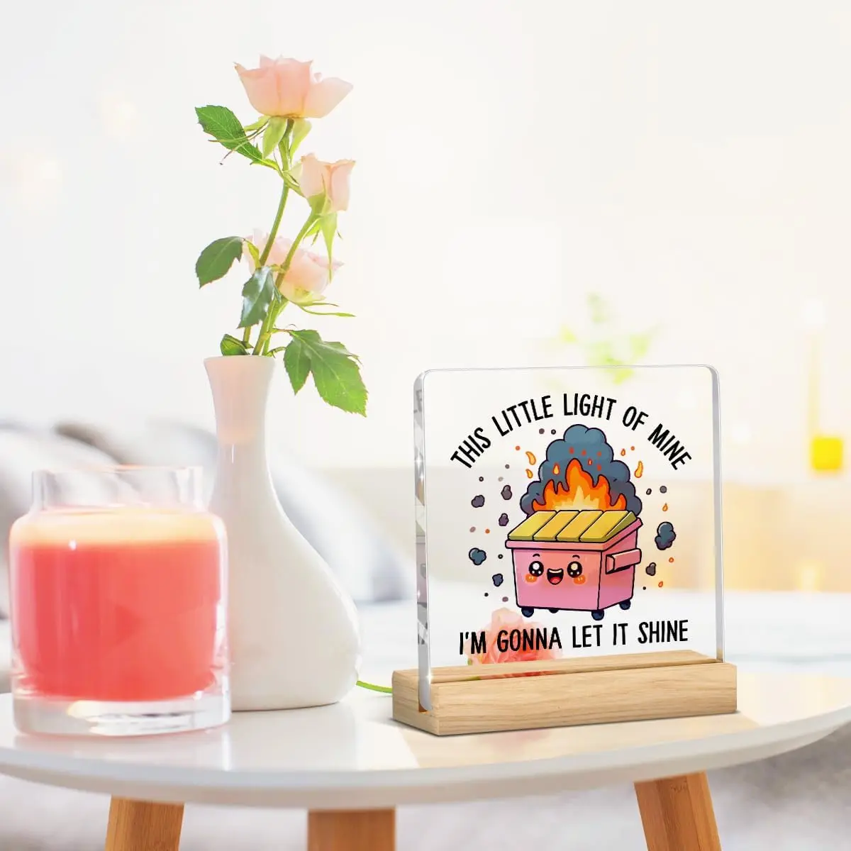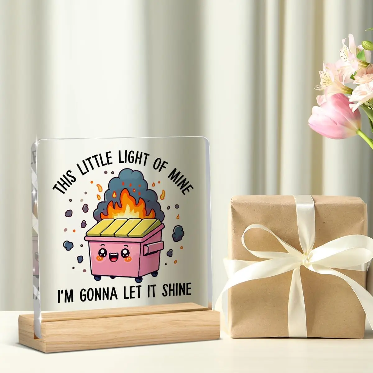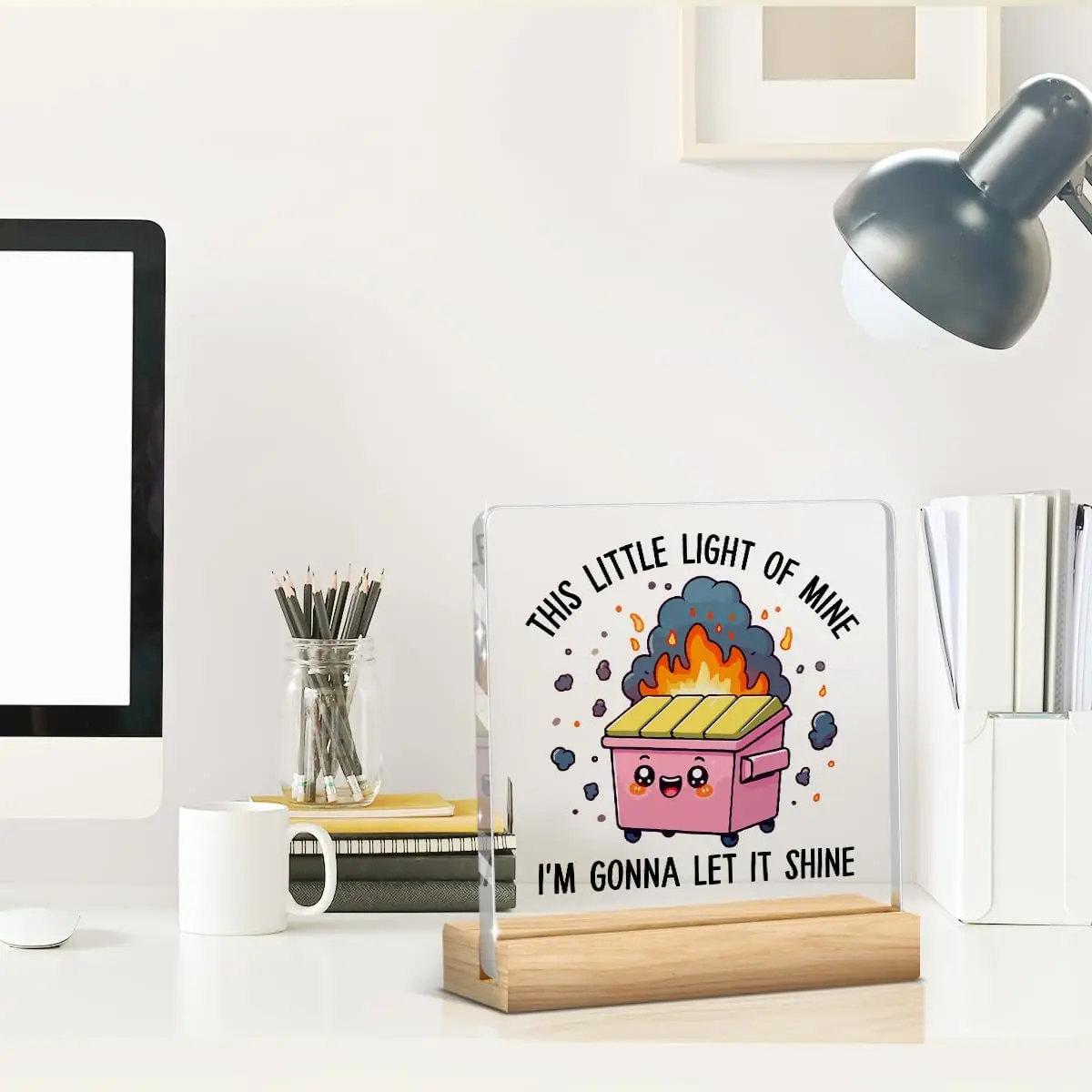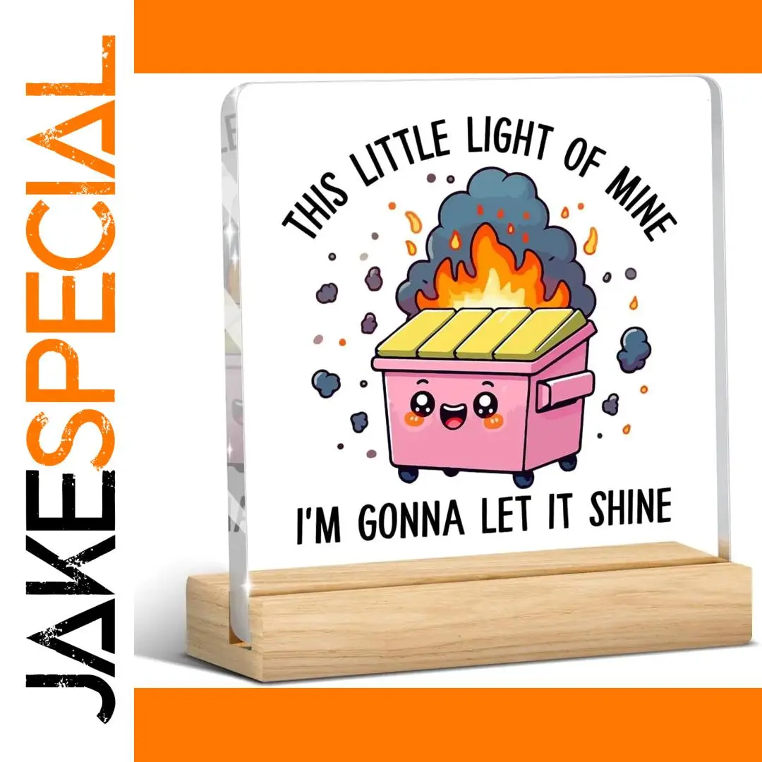 Add a touch of humor and inspiration to your workspace with this colorful desk decor featuring a playful pink dumpster with expressive eyes, a cheerful smile, and adorable blush spots. Topped with bright yellow, orange, and red stylized flames, surrounded by tiny smoke puffs and sparks, it captures a lively, animated vibe. The bold black all-caps text, “THIS LITTLE LIGHT OF MINE, I’M GONNA LET IT SHINE,” enhances its uplifting message. Mounted on a natural wooden base, this whimsical piece is crafted from durable plastic, making it an ideal office or coworker gift that brings cheerful energy and personality to any desk for both women and men.