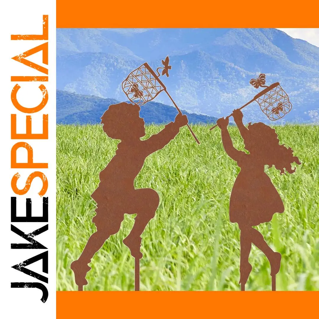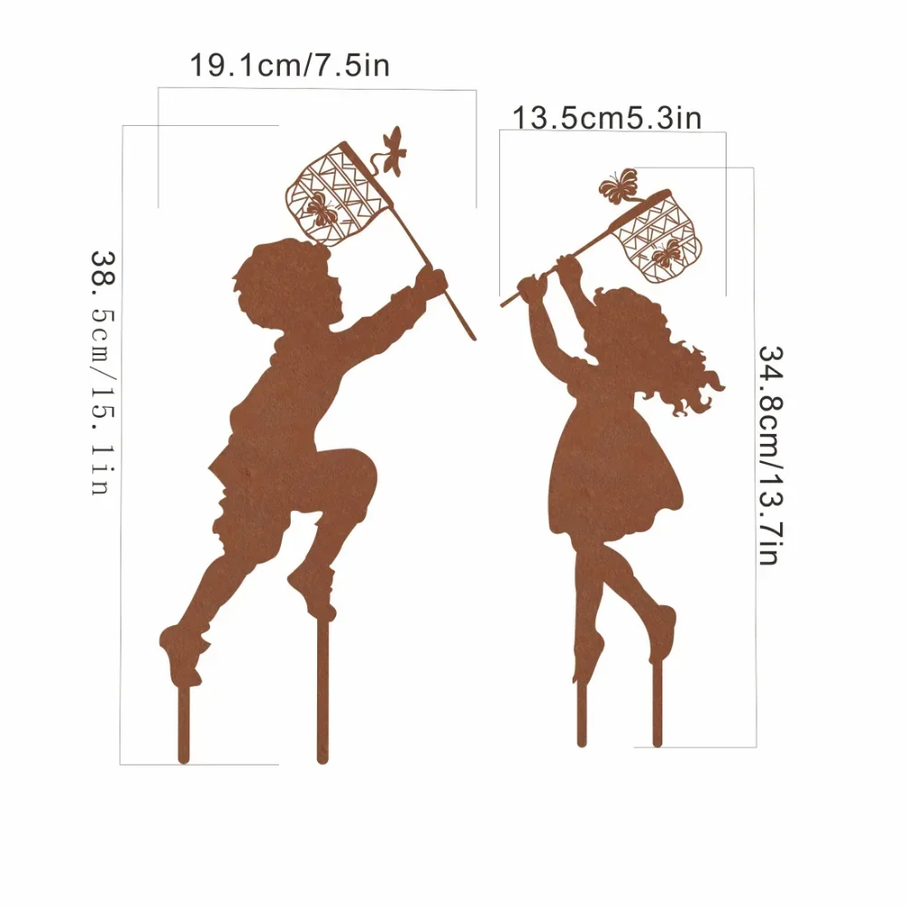 Imagine adding a charming touch to your outdoor space with this delightful metal garden decoration. Crafted from durable metal, it features the whimsical silhouettes of a boy and girl, each holding stick-like objects topped with intricately designed lanterns or baskets. The open lattice and flower details lend an airy, vintage charm perfect for farmhouse or country-style gardens. Its rust-colored finish provides a warm, earthy tone that blends beautifully with lush green surroundings. Designed for outdoor durability, this decoration is easy to place on the ground, remaining sturdy and stable in any weather. Whether in your garden, yard, or patio, it creates a joyful, inviting atmosphere that you'll love to admire daily.