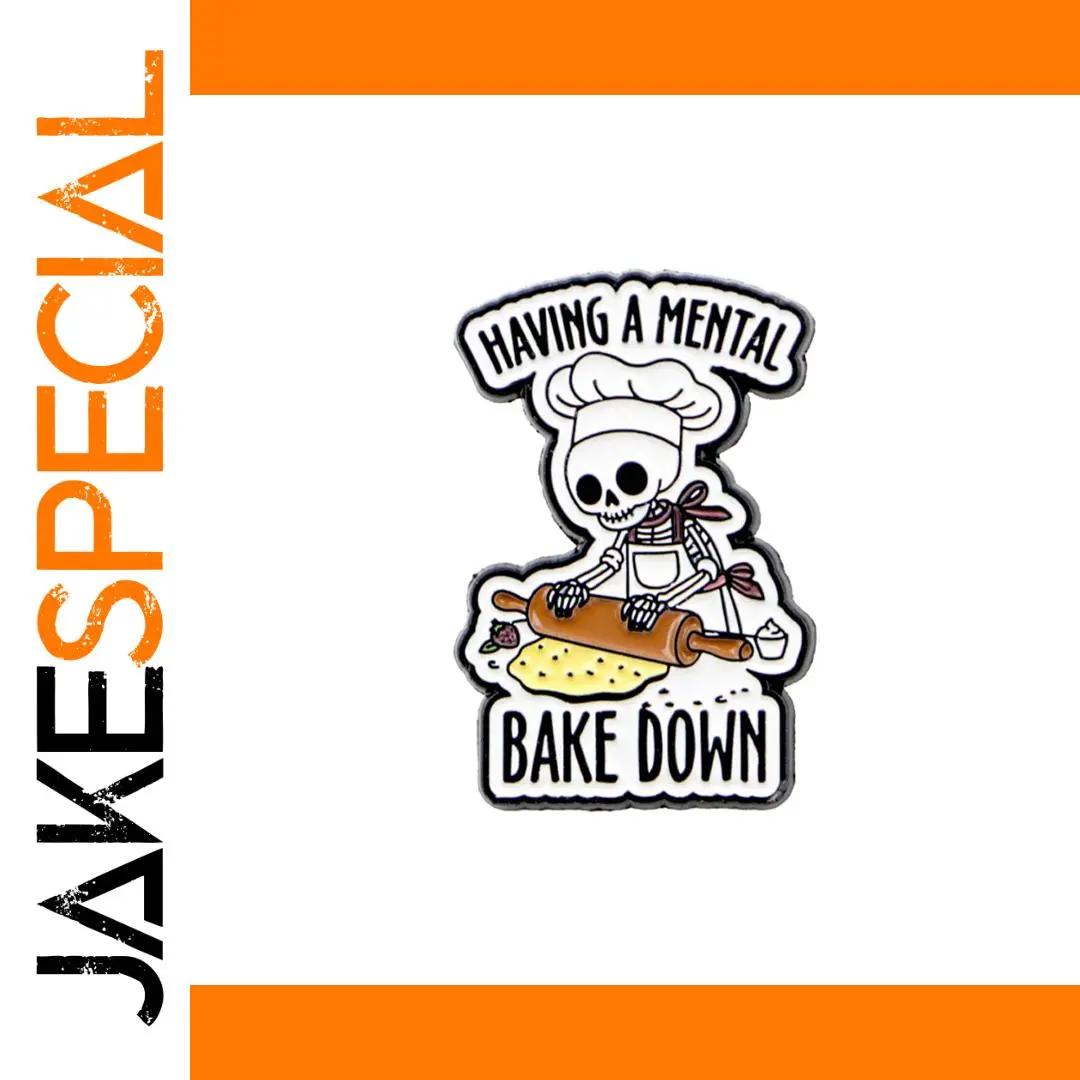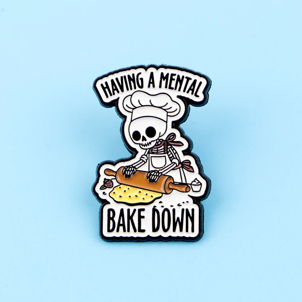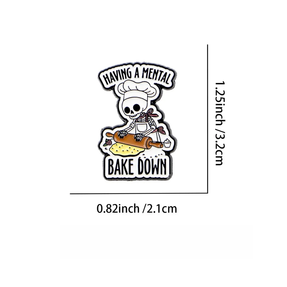 This Skull Quote Mental Brooch captures a unique blend of whimsy and style. The playful skeleton character, complete with a chef's hat and rolling pin, adds a fun touch to any outfit. Its intricate design features a striking color palette of black, white, and light tones, enhancing the cartoonish aesthetic. With bold phrases “HAVING A MENTAL” and “BAKE DOWN,” this brooch is perfect for expressing your quirky personality. It is crafted from durable alloy with a metallic finish and is shaped irregularly to follow the outline of the design, making it a fashionable accessory for jackets, hats, and backpacks.