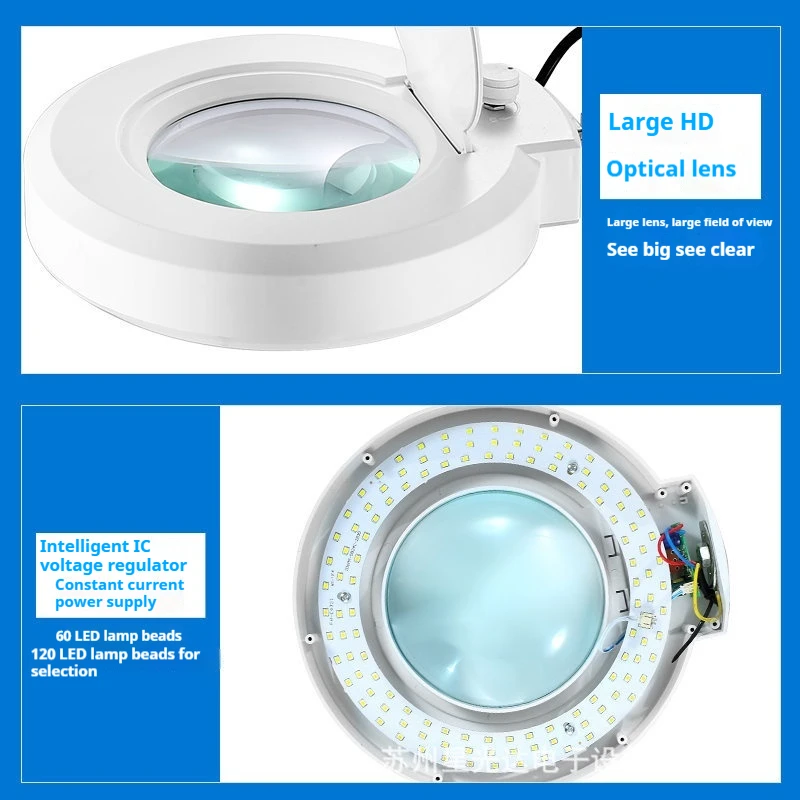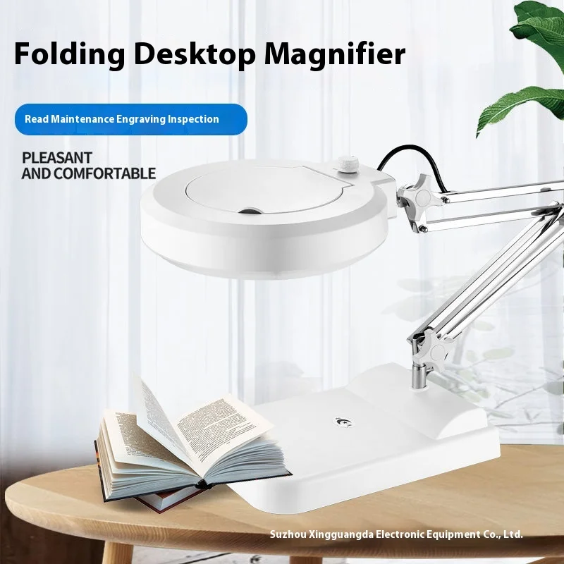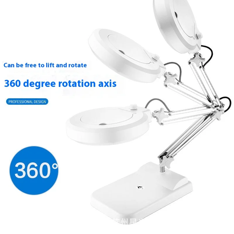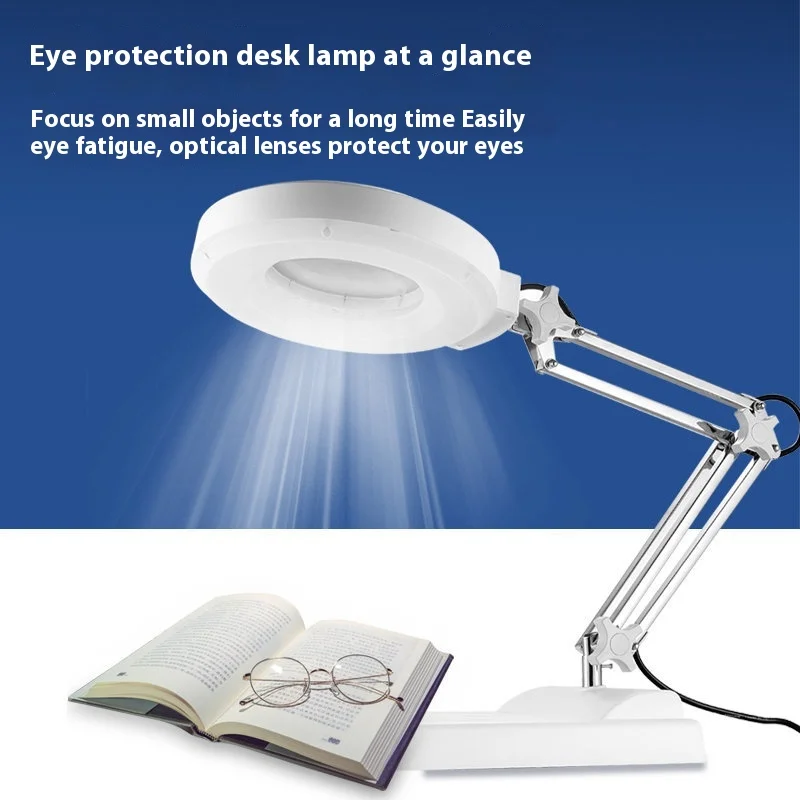 Enhance your detailed work with this sleek, modern desktop magnifying glass desk lamp featuring dual magnification options of 10X and 5X for versatile precision. The adjustable, dimmable LED lighting ensures optimal illumination, while the white plastic base with rounded edges provides a clean, minimalist aesthetic. An articulated chrome-finish arm offers flexible positioning, and the circular transparent lens is mounted on a hinged lid with a convenient control knob for easy adjustments. Designed for accuracy and comfort, this lamp is perfect for tasks requiring close-up inspection, such as crafting, electronics, or reading fine details, combining functional elegance with reliable performance.