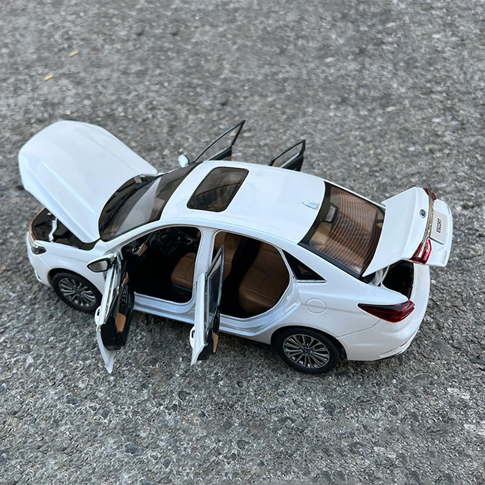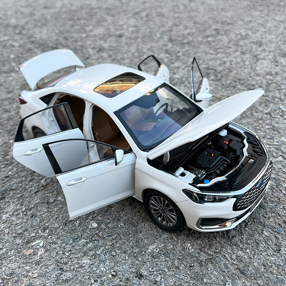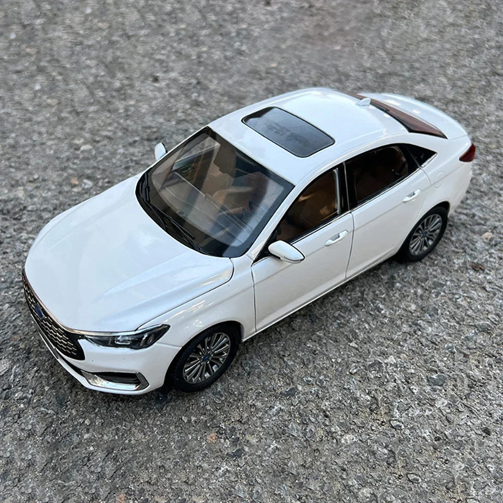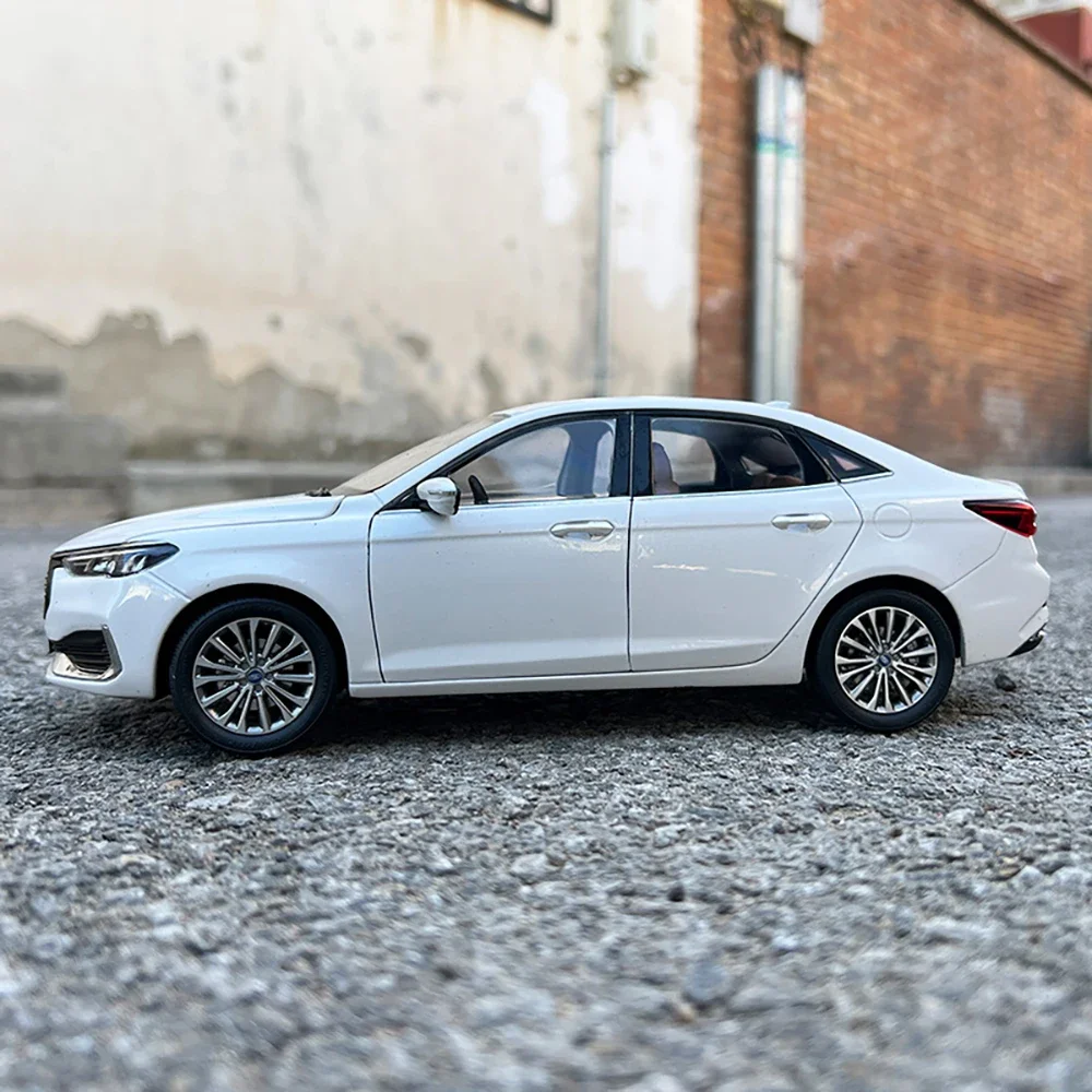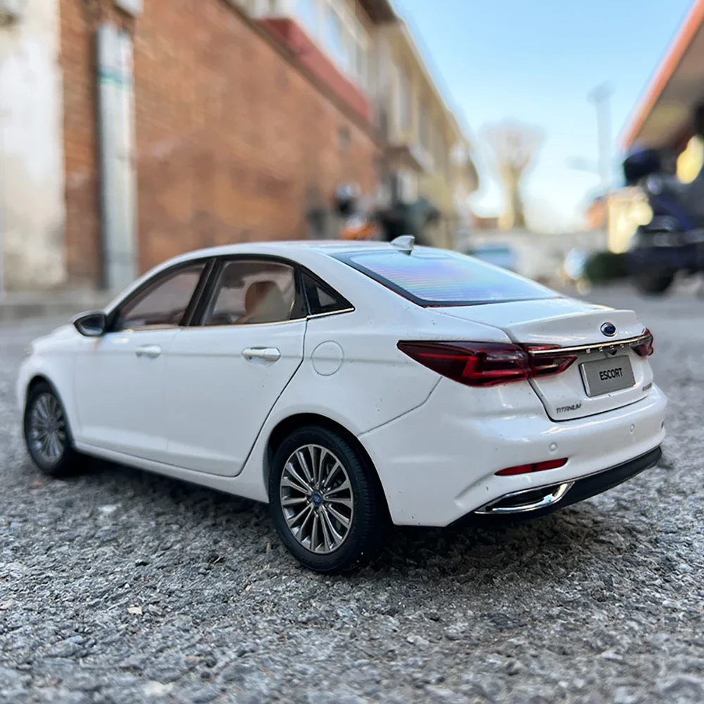 This highly detailed 1:18 scale die-cast model of the Changan 2022 Ford Escort features a sleek white alloy exterior measuring approximately 26 x 10 x 7 cm. Crafted from alloy, rubber, and ABS plastic, it boasts functional doors, front and rear covers, and moveable wheels for realistic display. The model captures the modern aerodynamic design with smooth curves, a black front grille with horizontal slats, narrow elongated headlights with detailed internal lenses, tinted windows with black trim, and a transparent sunroof. Ideal for collectors and enthusiasts, it serves as an elegant decorative piece or souvenir, emphasizing quality craftsmanship and attention to detail.