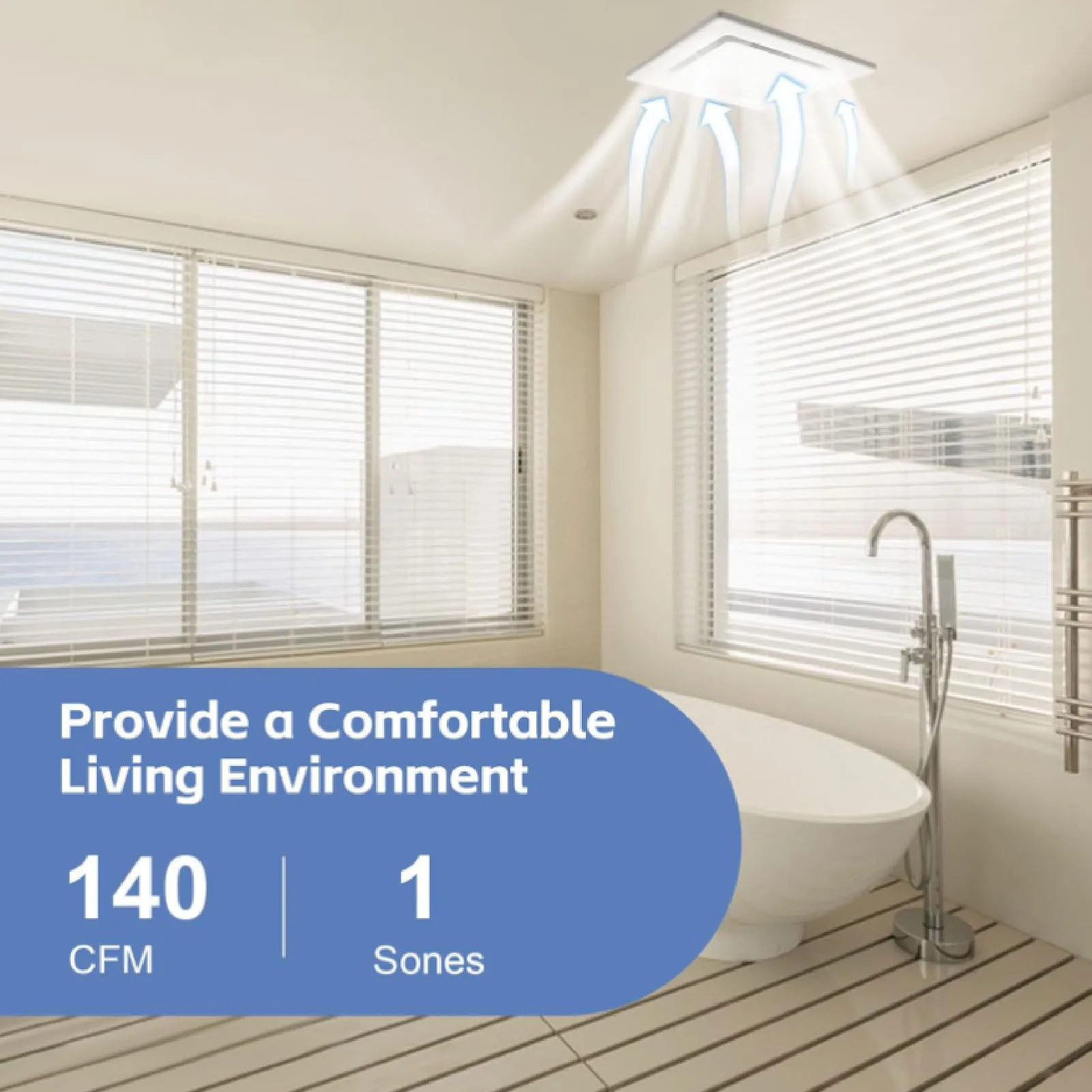 - High airflow of 140 CFM with a noise level of only 1 sone, ideal for bathrooms up to 100 square feet, ensuring effective ventilation and optimal air quality.