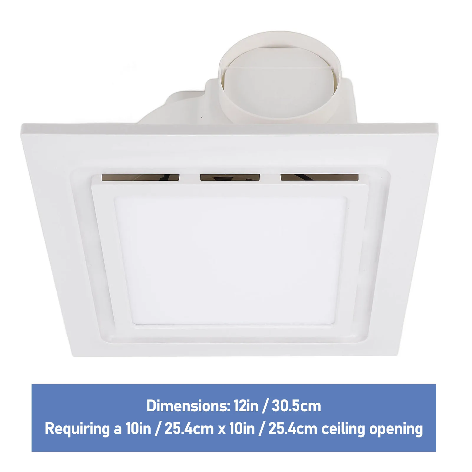 Experience the perfect blend of functionality and sleek style with this this white ceiling exhaust fan with light. Designed for modern bathrooms, it features a compact 12-inch square grille with a smooth, flat surface and elegant narrow vents on its sides, creating a minimalist aesthetic. The integrated diffused LED light provides soft, even illumination, enhancing your bathroom’s ambiance. Built from durable, rustproof ABS plastic, this fan offers long-lasting performance while maintaining a lightweight profile. Its quiet operation at just 1 sone ensures a peaceful atmosphere. With a high airflow rate of 140 CFM, it efficiently disperses steam and controls humidity in spaces up to 100 square feet, making your bathroom cleaner and more comfortable.