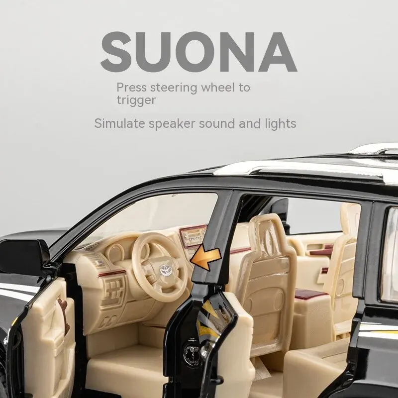 Immerse yourself in the detailed craftsmanship of this white 1:24 scale diecast Land Cruiser model, meticulously designed for auto enthusiasts and collectors alike. With its sleek, glossy white finish, sharp body lines, and realistic features, it perfectly captures the bold and stylish essence of the original vehicle. Its detailed chrome grille, multi-spoke alloy wheels, and transparent headlights add a touch of elegance and authenticity. The functional doors, hood, and trunk allow you to explore the intricate internal structure. Enhanced with lighting and sound effects, this model offers a more immersive experience. Lightweight yet durable, it’s built from high-quality diecast metal to ensure longevity and stability. Whether for display or gifting, it’s a captivating collector’s piece that exemplifies precision and style.