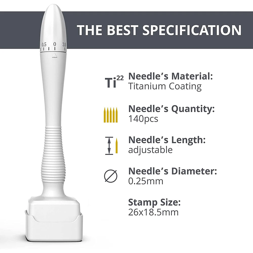 - Technical specifications: needle material – medical stainless steel; needle count – 140; adjustable depth – up to 0.25mm; color – white; manual operation, no power required.