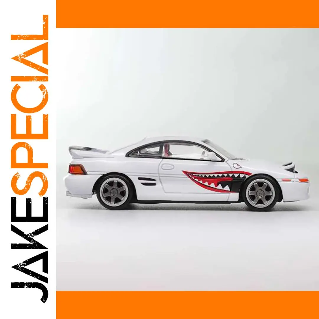 This exquisite 1:64 scale diecast alloy model of a classic sports coupe offers a sleek, low-profile design in crisp white, featuring realistic details such as metallic multi-spoke wheels, side air vents, and a rear spoiler for aerodynamic appeal. A bold, red-outlined graphic on the side adds an aggressive, shark-inspired touch. The transparent windows reveal a minimal interior with seats and a steering wheel, complemented by molded front and rear features like headlights and taillights, all crafted with precision for a high-quality collectible appearance. Suitable for display, decoration, or gifting, this fragile, meticulously detailed model is ideal for collectors aged 14 and older.