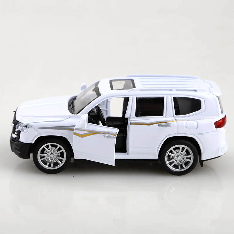 This meticulously crafted miniature alloy car model embodies modern design and realistic detailing, making it a perfect addition to any collection or a thrilling toy for young enthusiasts. With a sleek white finish and subtle gold stripe accents along the sides, it exudes elegance and sporty appeal. The textured exterior replicates a sports utility or crossover SUV, complete with sculpted lines on the hood, a black grille featuring LED-style headlights, and valuable details like panoramic sunroof and detailed alloy wheels. Its diecast metal construction ensures durability and a premium feel, making it suitable for both display and play. This pullback toy offers a close-to-real experience in a compact, collectible package, ready to be admired or enjoyed.
