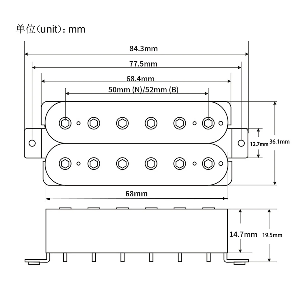- Each pickup has 12 adjustable hexagonal screw pole pieces, with a pole spacing of 50mm for neck and 52mm for bridge, allowing for precise customization and sound shaping.