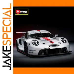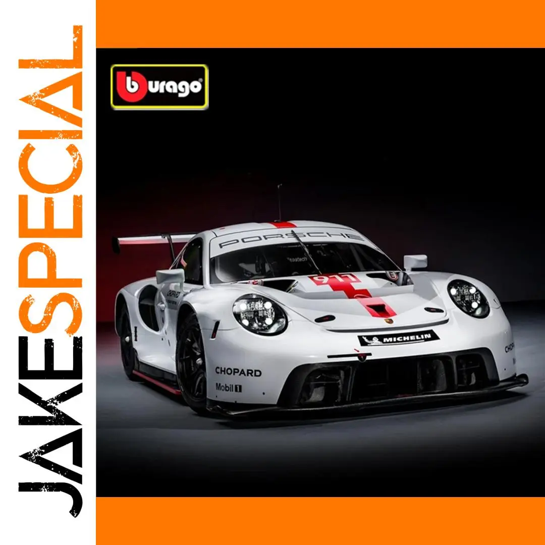 This highly detailed 1:24 scale diecast model of the Porsche 911 RSR racing car features a sleek white exterior with black accents and a striking red stripe down the hood. Made from alloy and plastic, it showcases intricate craftsmanship, realistic racing decals, large rear wing, wide racing tires on black multi-spoke rims, and detailed lighting elements. Designed for collectors and enthusiasts, this non-electric, hazard-free model is suitable for ages 4 to adult and is ideal for display or as a premium gift. Built to high standards with precise proportions, it captures the high-performance spirit of the Porsche 911 RSR racing car.