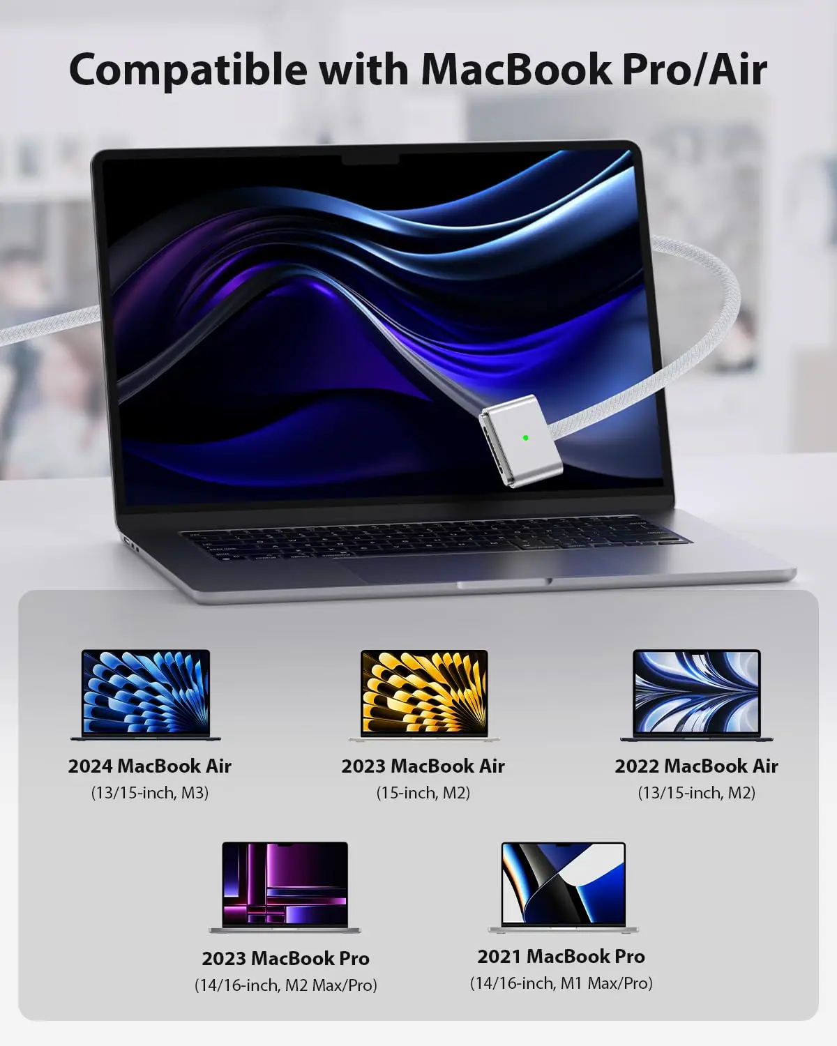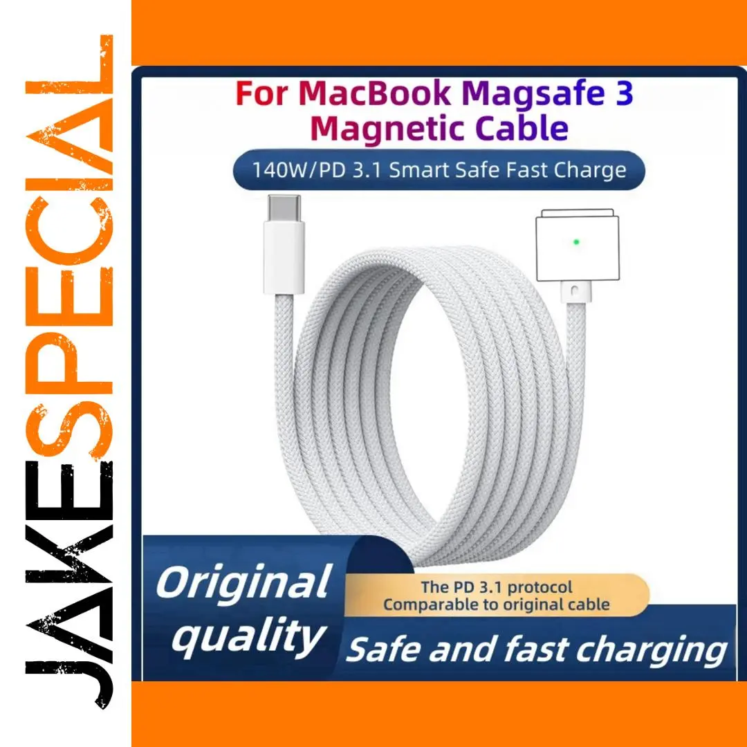 Experience fast, reliable charging with this 2-meter magnetic braided USB-C to Magsafe 3 cable, supporting a power delivery capacity of 140W. Crafted with a durable, textured braided design, it offers flexibility and longevity while maintaining a sleek, modern appearance. Available in Silver, Midnight Blue, Starlight, Dark Grey, and Black, this cable is compatible with various MacBook models including MacBook Air (15-inch M2, 2023; 13-inch M2, 2022) and MacBook Pro (14-inch and 16-inch, 2021 and 2023). Certified with CE, FCC, and RoHS standards, it ensures safe, efficient charging for your Apple devices with a stylish, minimalist aesthetic.