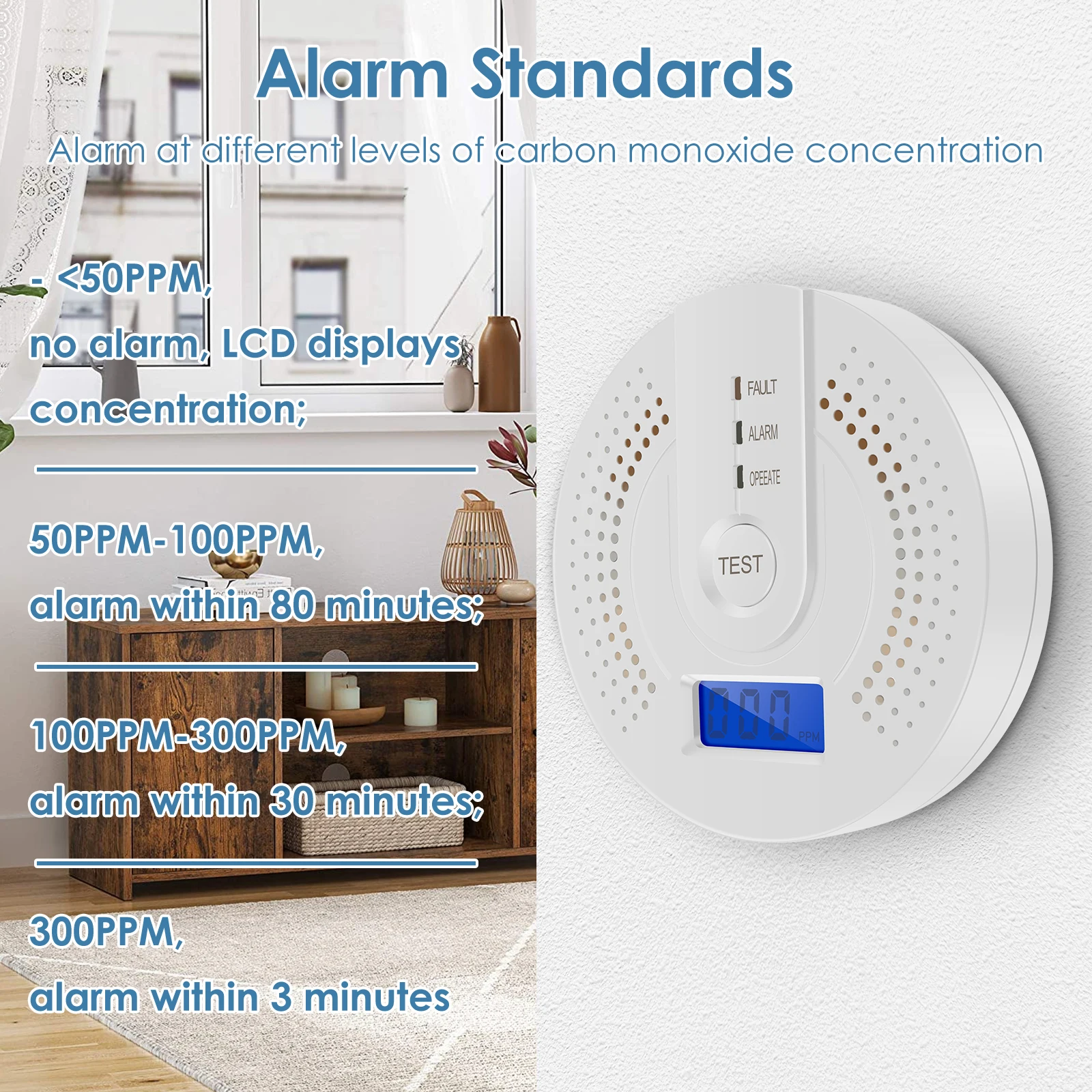 - Advanced alert system triggers an 85 dB alarm and flashes a red indicator light at 150 ppm, with response times within 3 minutes at 300 ppm and between 30 to 80 minutes at lower concentrations.