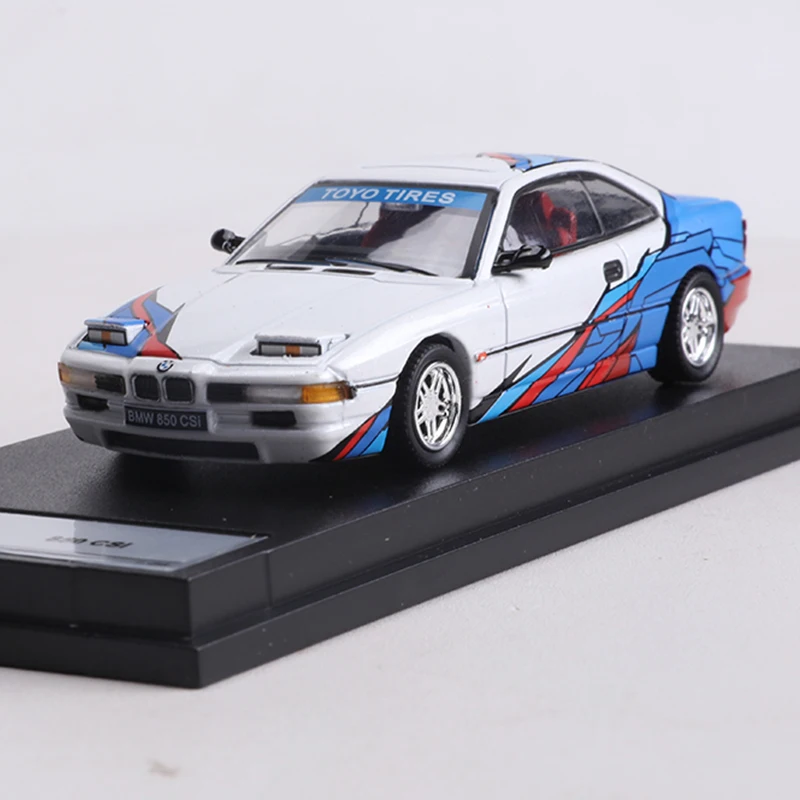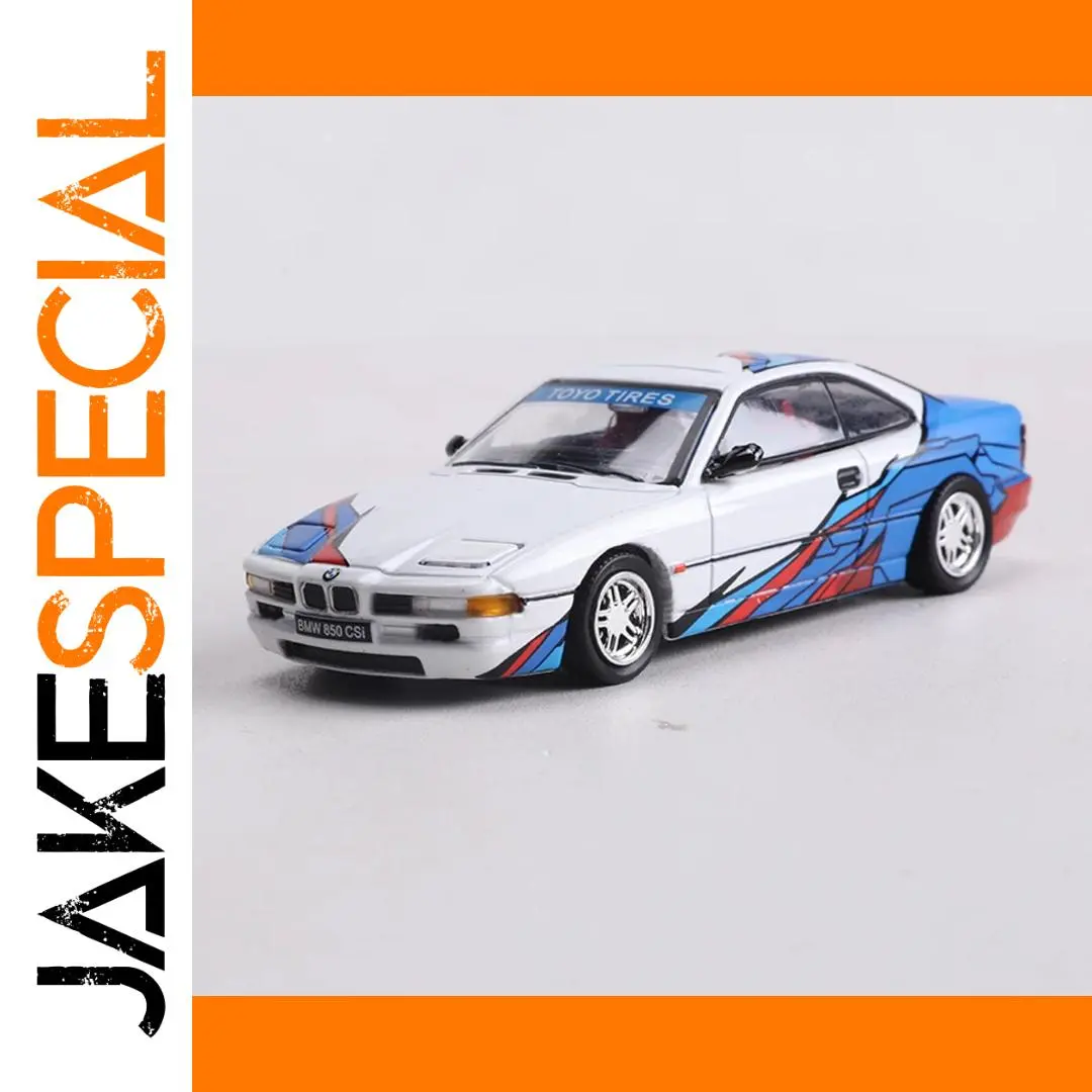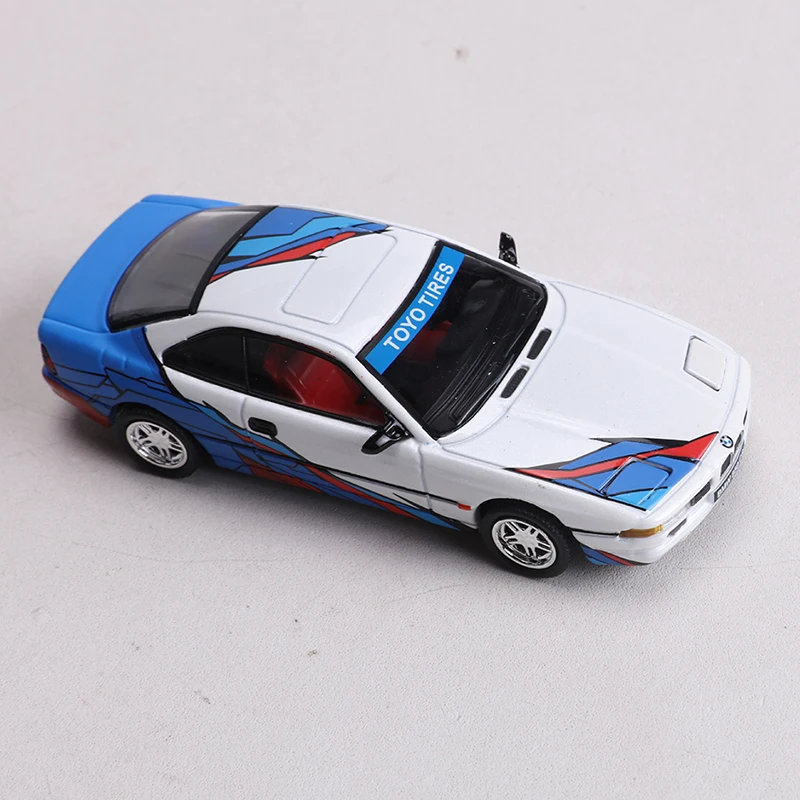Experience the thrill of owning a meticulously crafted scale model of the iconic 1985 BMW 850CSI. Perfect for enthusiasts and collectors, this 1:64 scale diecast model captures every detail with precision, from the sleek, aerodynamic body to the dynamic racing graphics. The predominantly white finish is accented by bold blue, red, and black graphics that emphasize its sporty character. Features include integrated headlights with clear lenses, subtle orange turn signals, multi-spoke alloy rims, textured black tires, and a blue “TOYO TIRES” decal on the roof, all adding to its realistic look. Ideal for display, it brings a touch of automotive history and racing spirit to any collection.