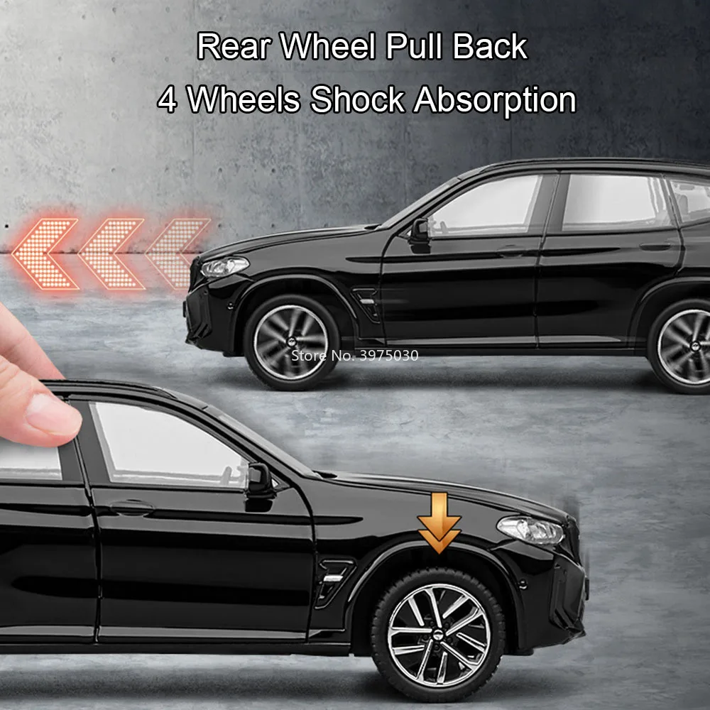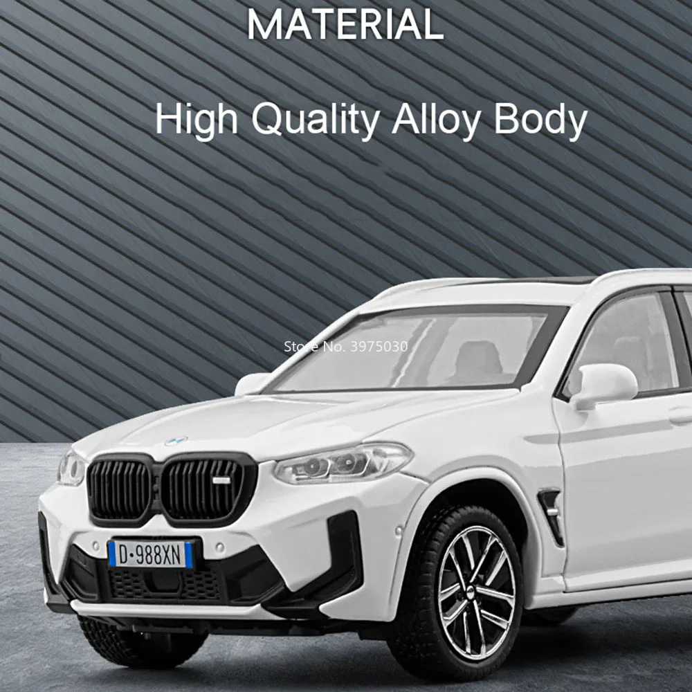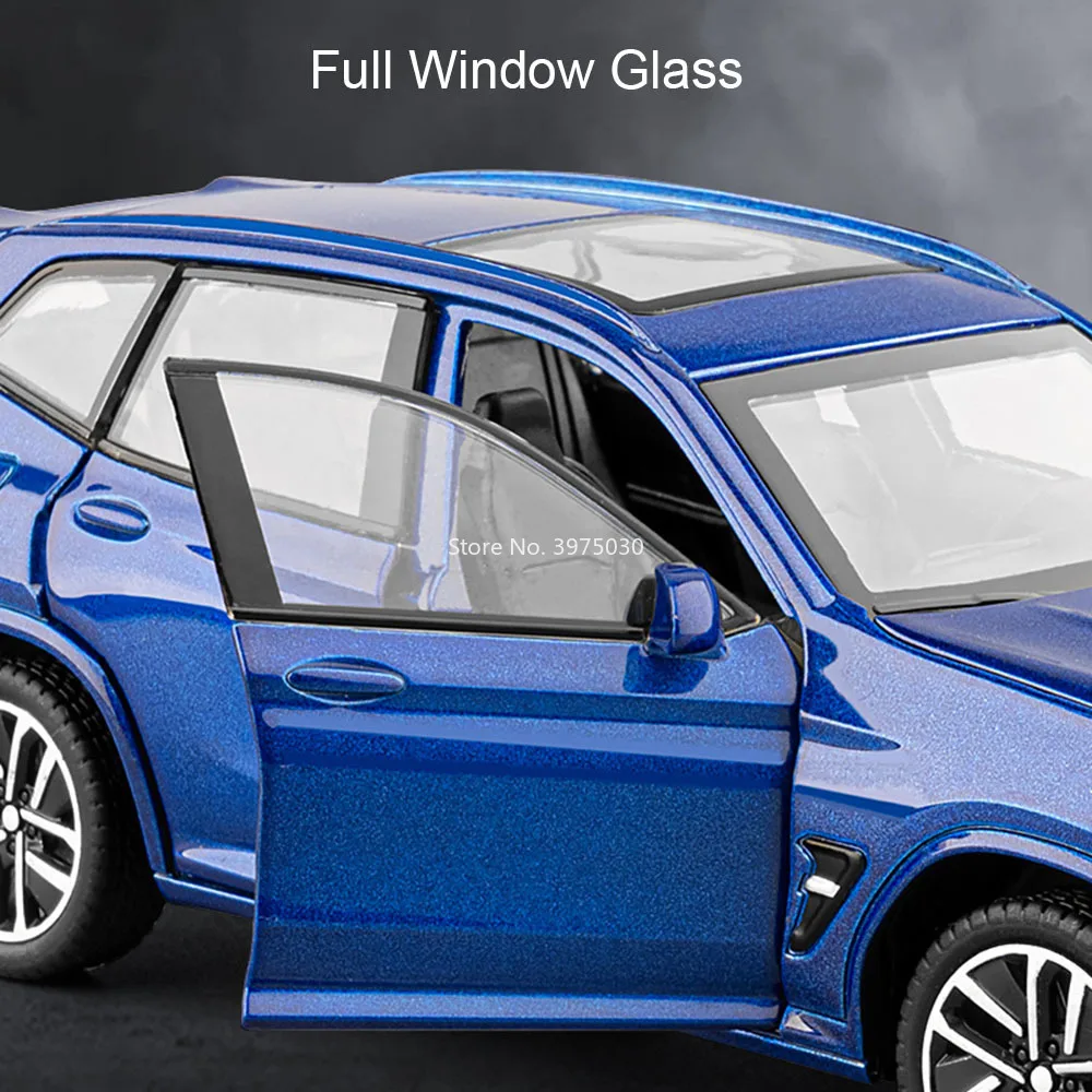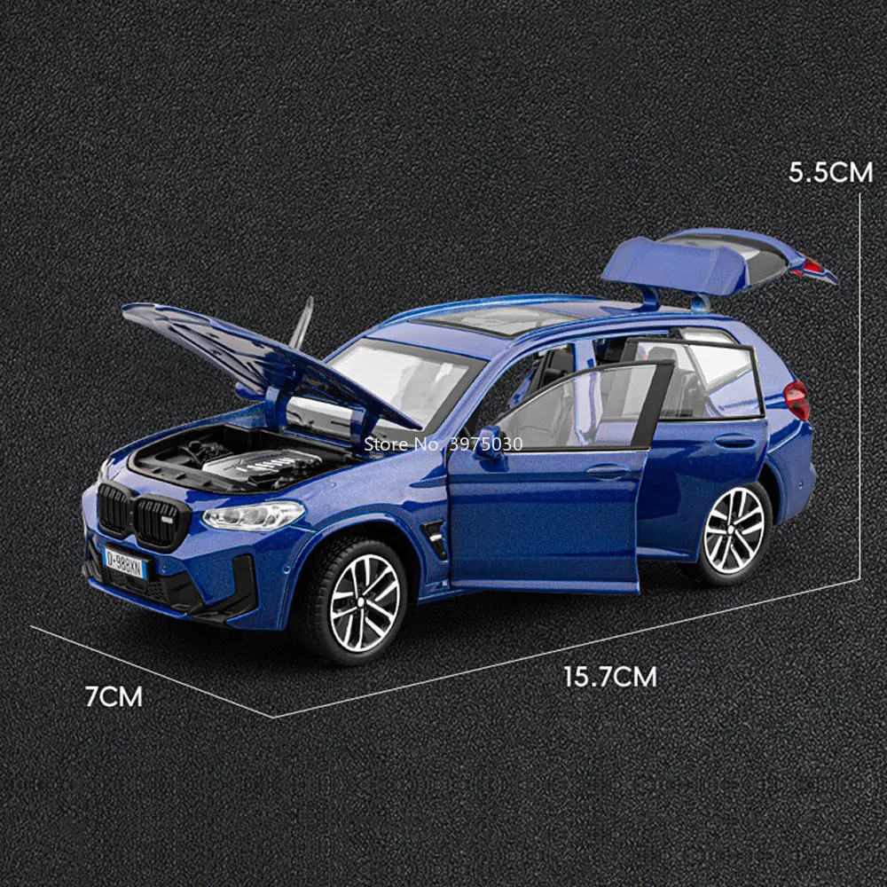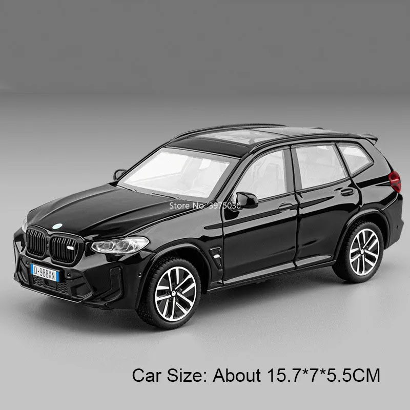 Transform your collection with these highly detailed 1:32 scale diecast alloy car models, available in Blue, White, Black, and Red for the X3M, and Black and Red for the X7. Crafted with a zinc metal body, plastic chassis, and rubber tires, these models measure approximately 15.7 x 7 x 5.5 cm for the X3M and 16.1 x 6.6 x 5.6 cm for the X7. They feature six opening doors, and realistic functions including sound, light, and pull-back action, all packaged in a durable alloy build that ensures longevity and authentic appeal. Perfect for adult collectors seeking high-quality, detailed miniature vehicles.
