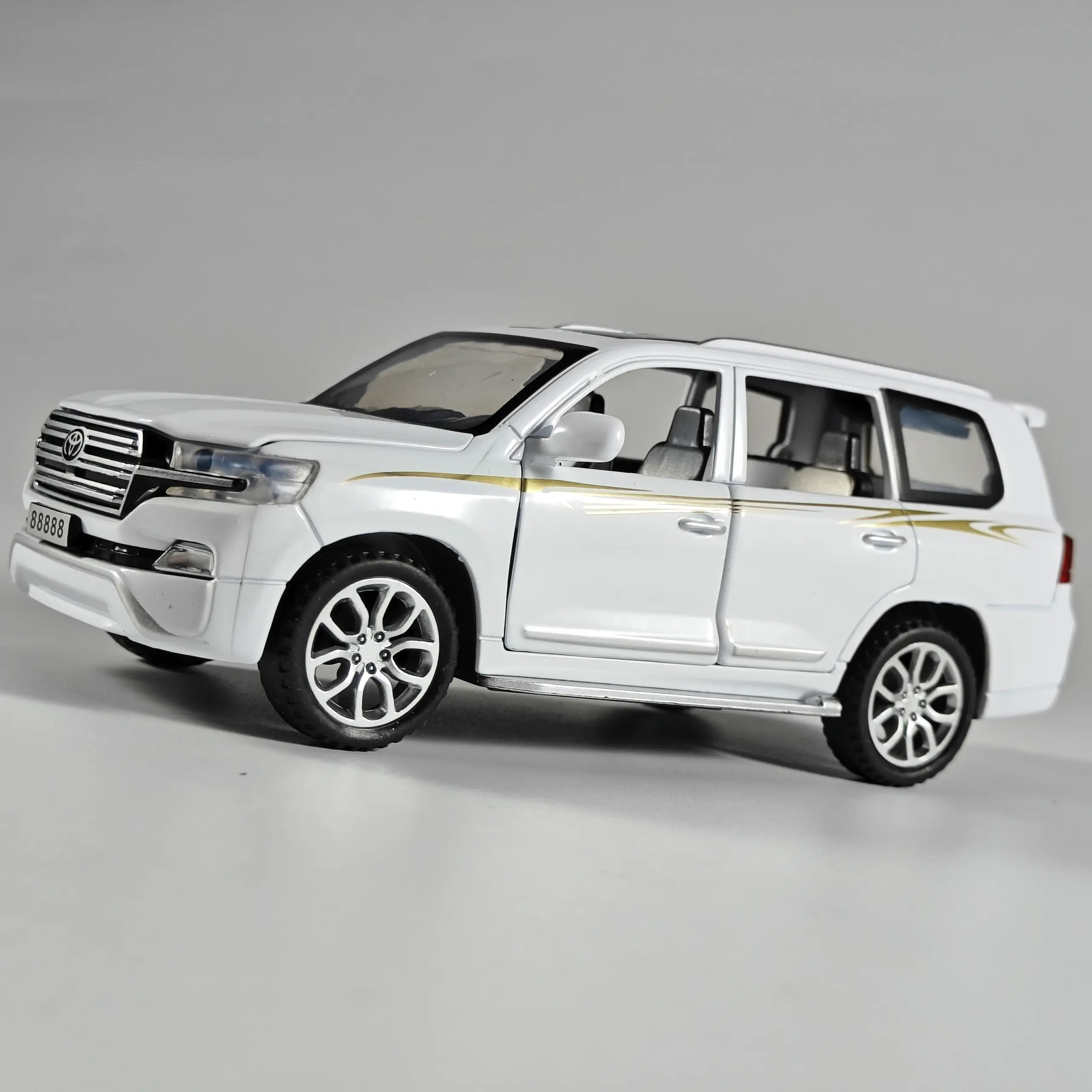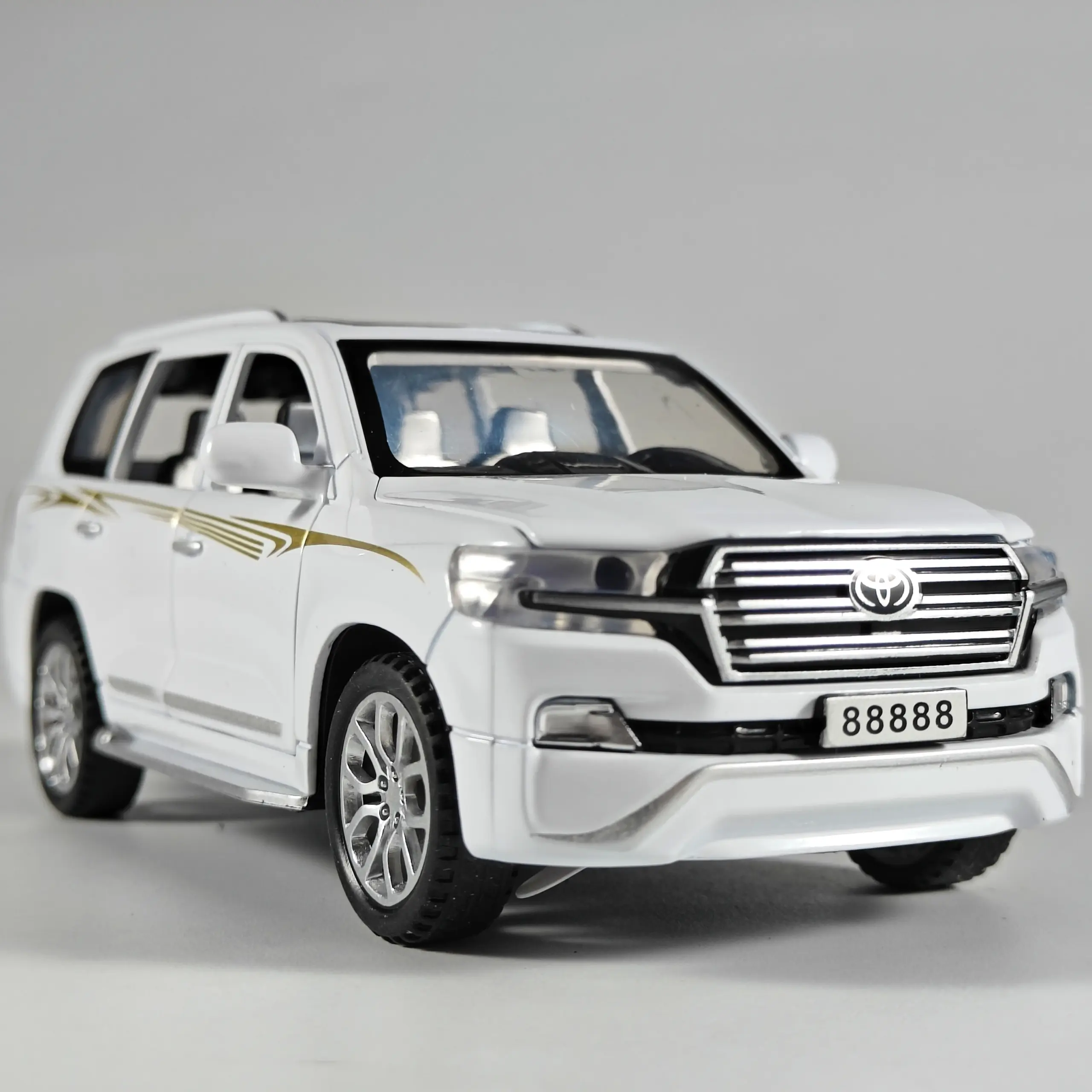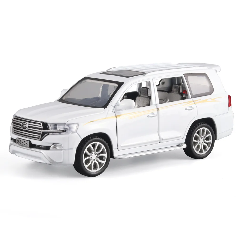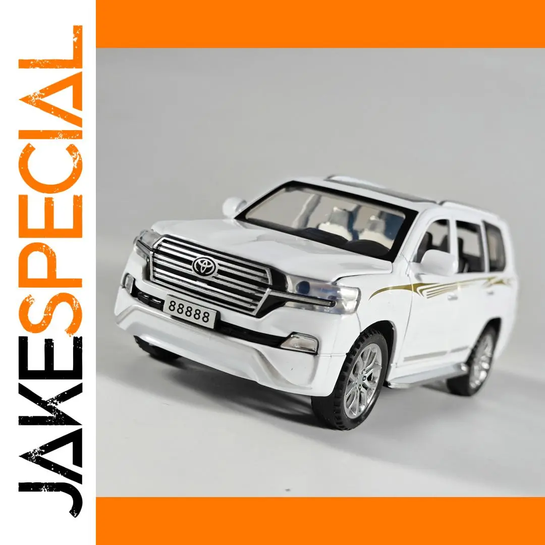 - Constructed from durable diecast metal with a glossy white finish, this detailed model captures the true look of the Toyota Land Cruiser with elegant silver accents and golden stripes.