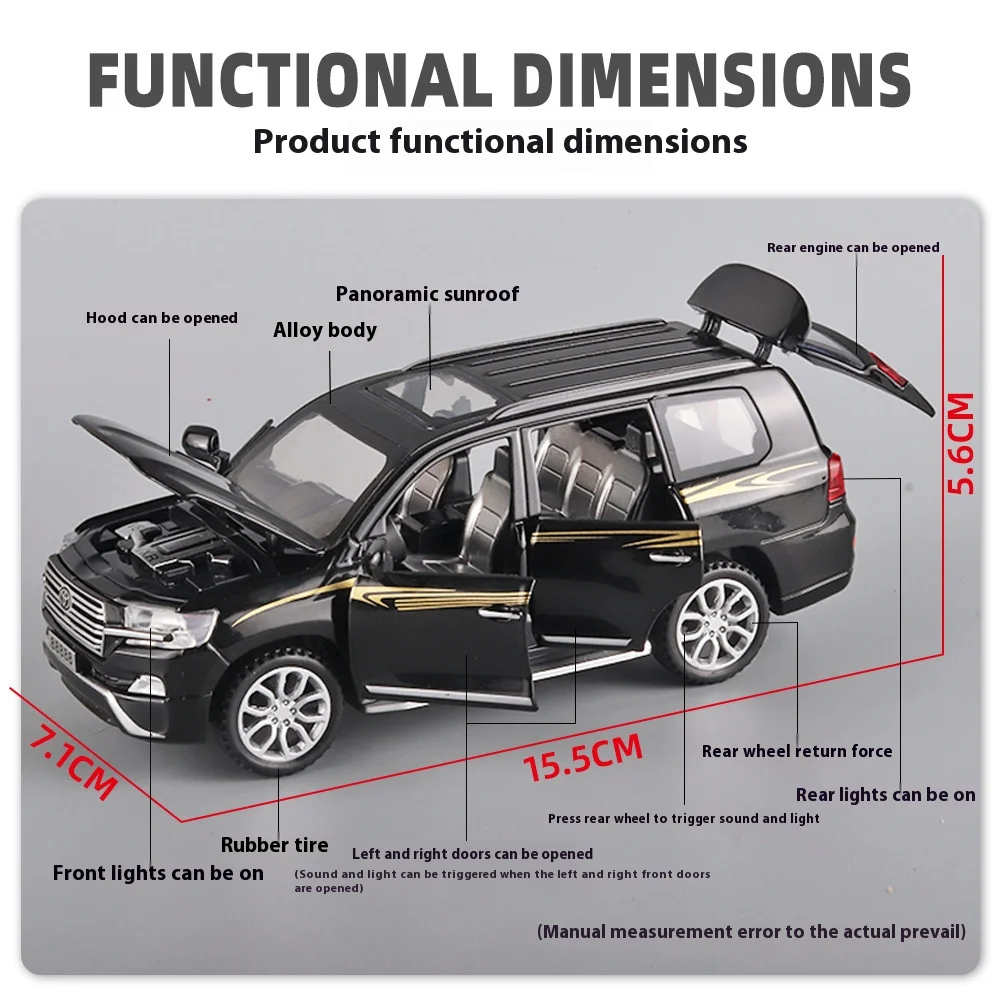 Enhance your space with this beautifully detailed miniature of the Toyota Land Cruiser. Its realistic features, interactive elements, and elegant design make it an ideal gift or display piece for adult collectors. You can already imagine it gracing your desk or shelf, captivating attention with its craftsmanship and subtle luxury. Don’t miss the chance to own such a versatile and impressive model—bring home this exceptional replica and enjoy adding a touch of realism and style to your collection today!