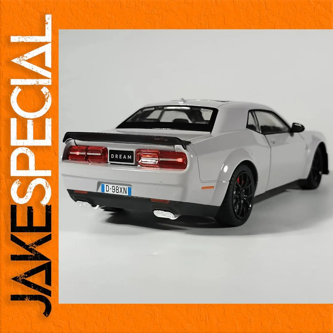 Experience the thrill of owning this meticulously crafted miniature of the iconic Dodge Challenger Hellcat Redeye. With a sleek white finish, this diecast model captures the car's aggressive and aerodynamic profile, highlighting its muscular contours and sporty lines. Measuring approximately 10 centimeters in length, it offers a realistic weight thanks to its durable metal body, perfect for display or collection. Every exterior detail, from the segmented red taillights and subtle rear spoiler to the black side mirrors and metallic silver exhaust tips, emphasizes its high-performance design. Vibrant red brake calipers peek through multi-spoke black rims, adding to its sporty aesthetic. This model embodies dynamic automotive elegance while providing interactive sound and light features for an engaging experience.