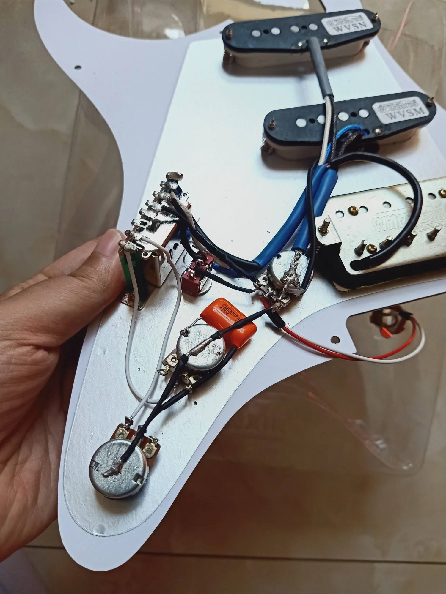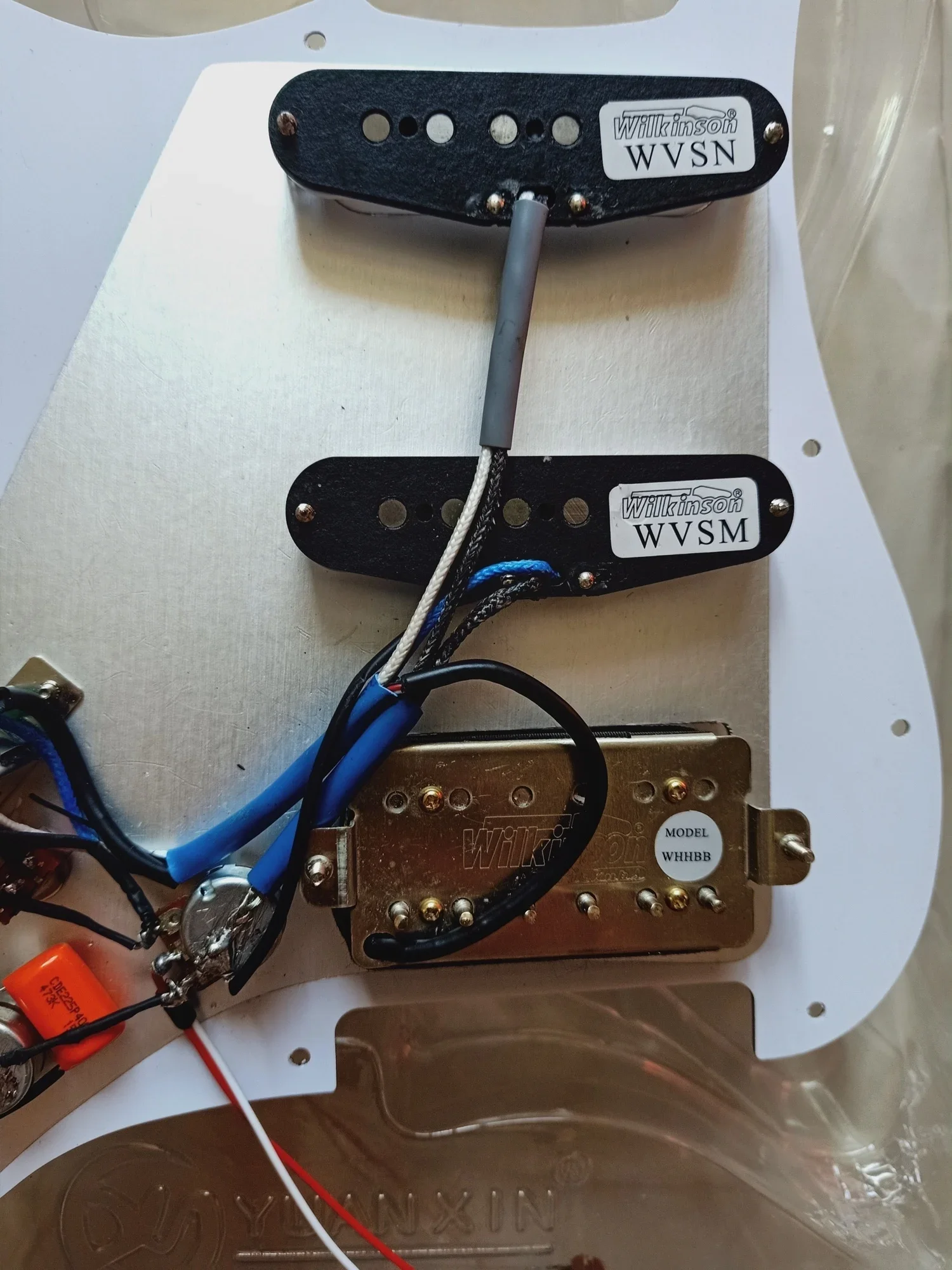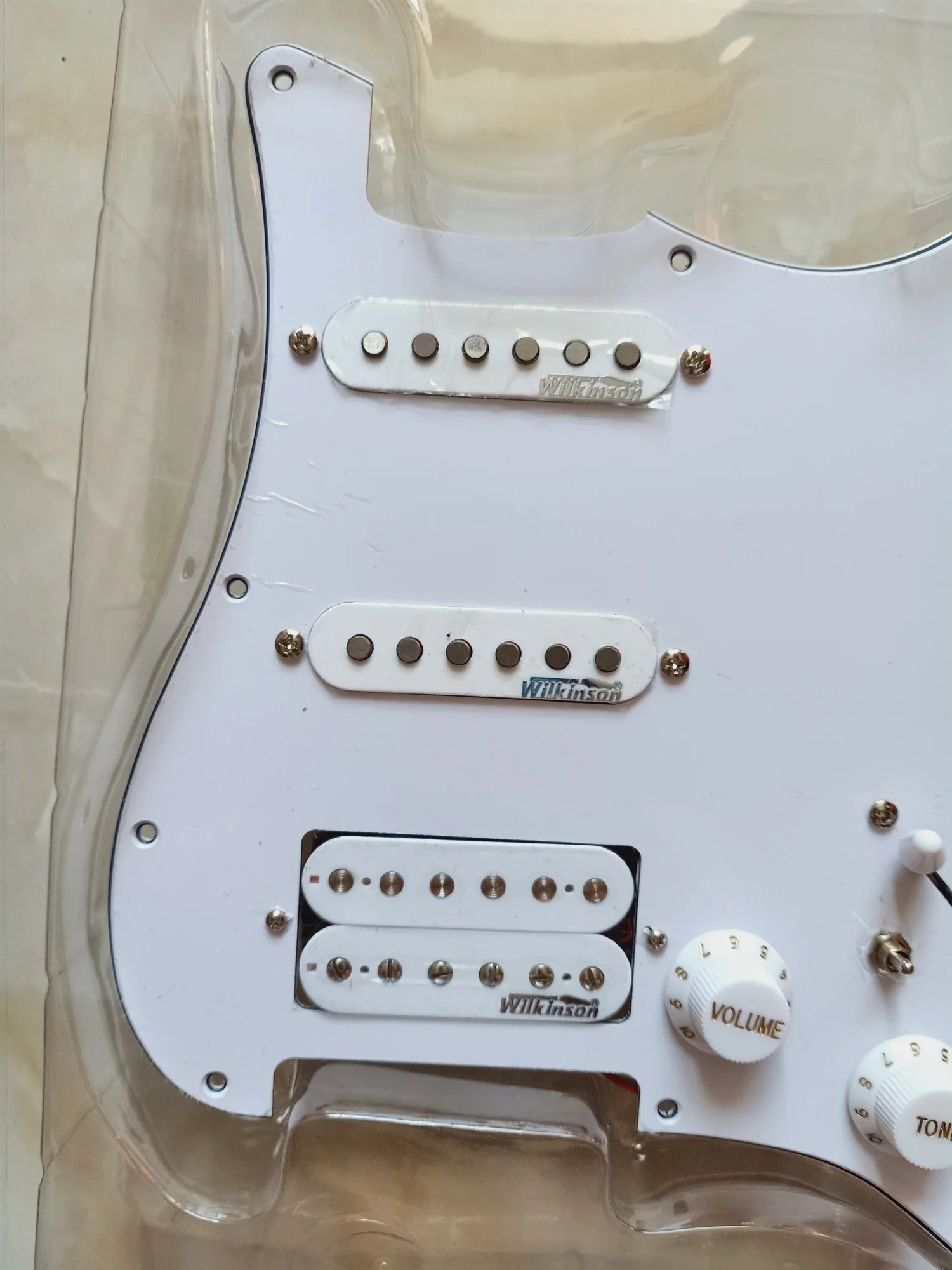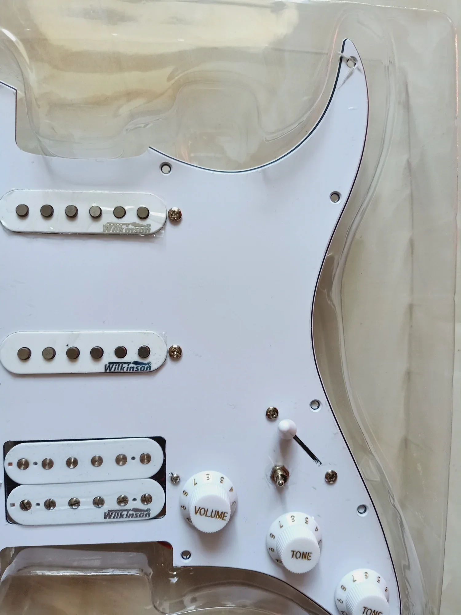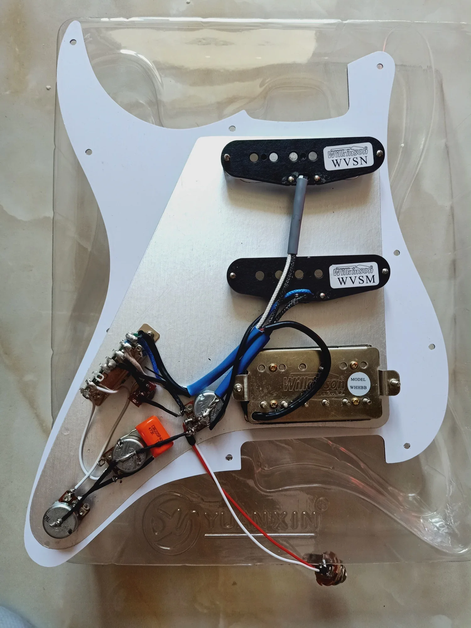 Enhance your guitar’s tone with this vintage white, prewired Fender Stratocaster-style pickguard set, featuring two Alnico V single-coil pickups (5.25KΩ and 5.35KΩ) and a wax-potted humbucker (14.13KΩ). Measuring 285x220x60mm and weighing 700g, it includes a 5-way switch, a single-cut toggle switch, three potentiometers, a USA-made 473J 400V capacitor, and an Epiphone output jack. The 3-ply thick pickguard, finished with a scratch-preventive film for protection, offers a classic and elegant look compatible with U.S. and Mexican Fender and Squier Strat models. Easy to install, it delivers versatile, high-quality sound with a sleek, polished aesthetic.